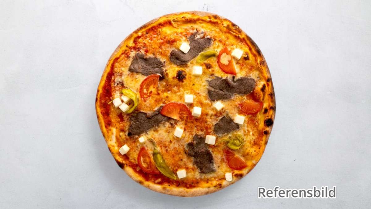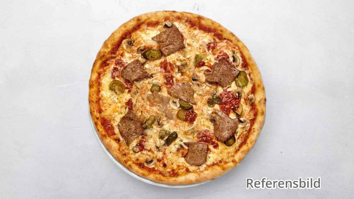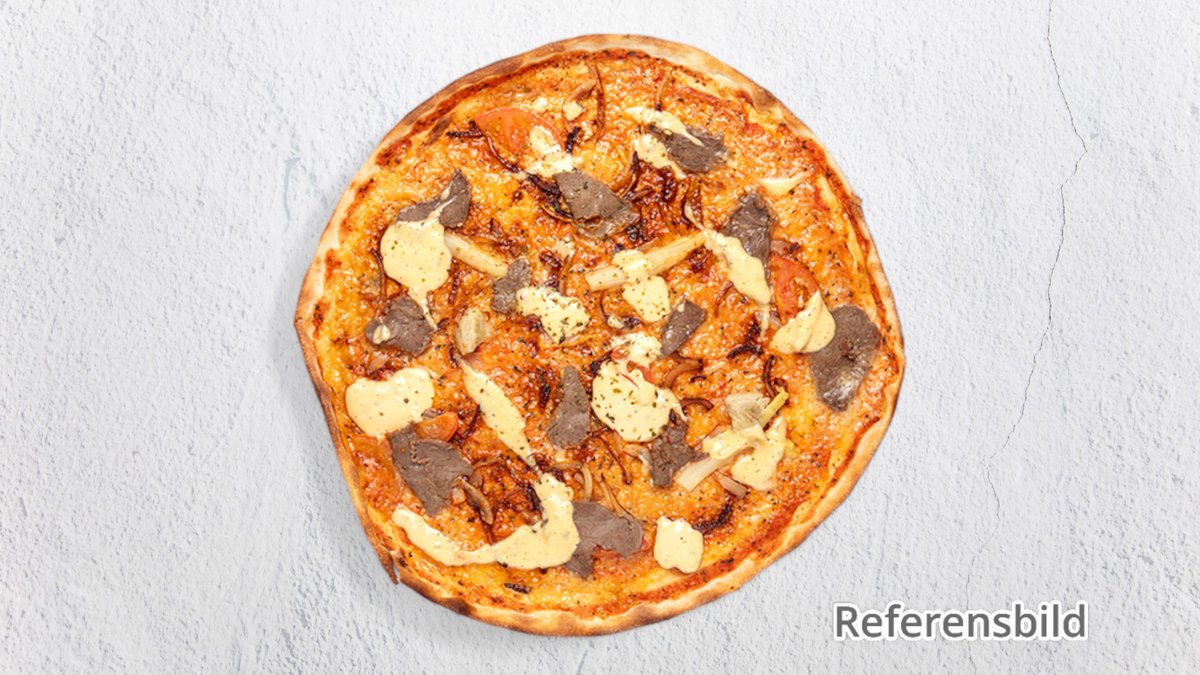 Ost, champinjoner, lök, svarta oliver, sparris och kebabsås.