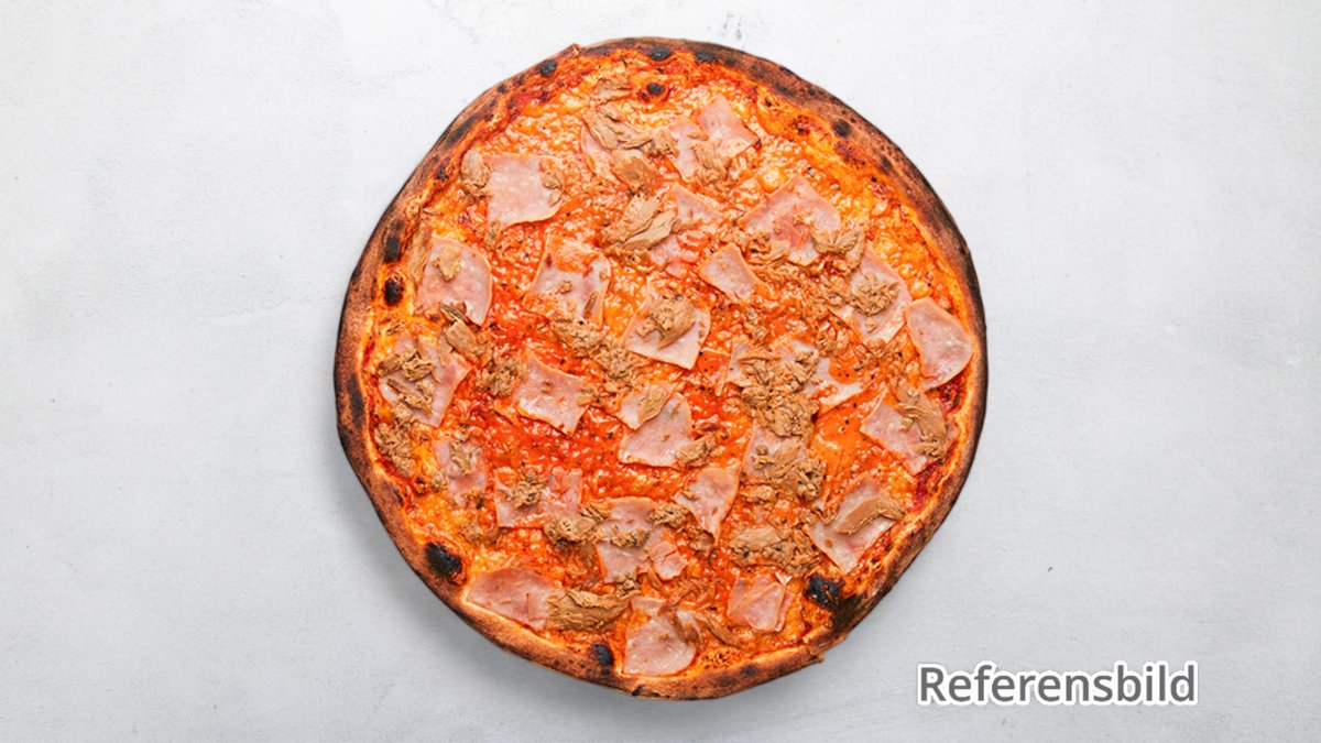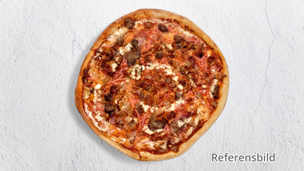 Skinka, lök, kebabkött, färska tomater isbergssallad, strips och kebabsås.