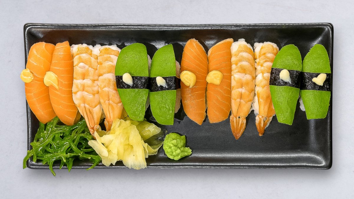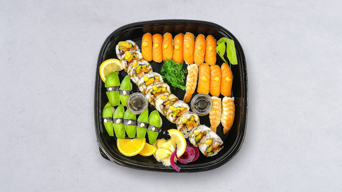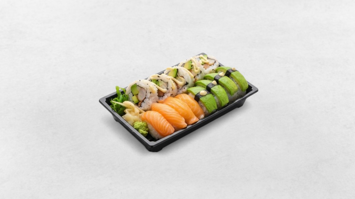 10 st maki, 8 st lax, 6 st avocado, 2 st räkor och 4 st kockens val.