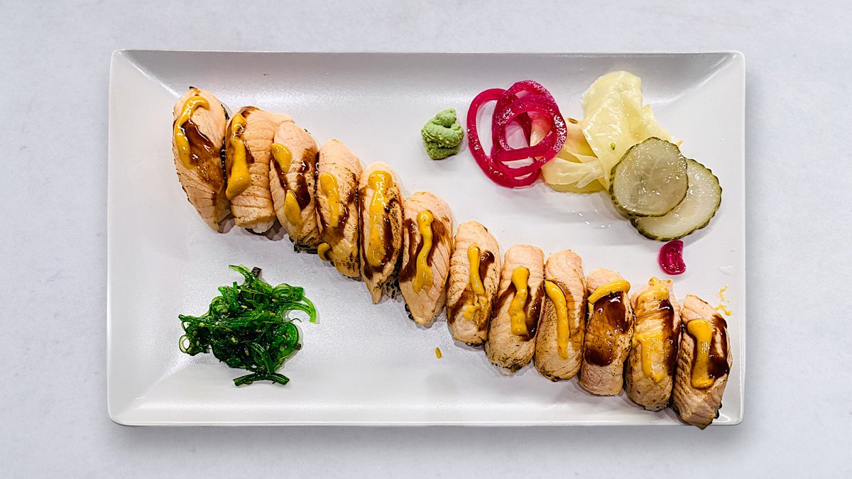 Flame grillad lax nigiri med chilimajonnäs och rostad schalottenlök.