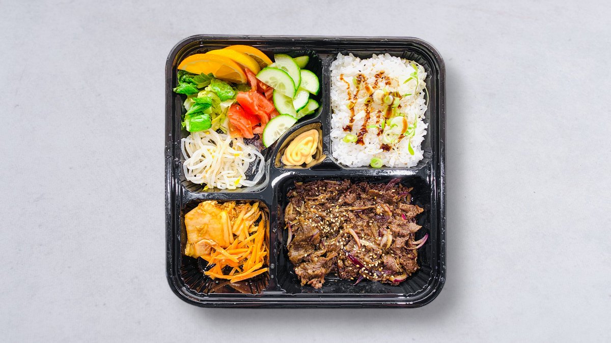 Tun skivad biff med yakinurash, ris och sallad.