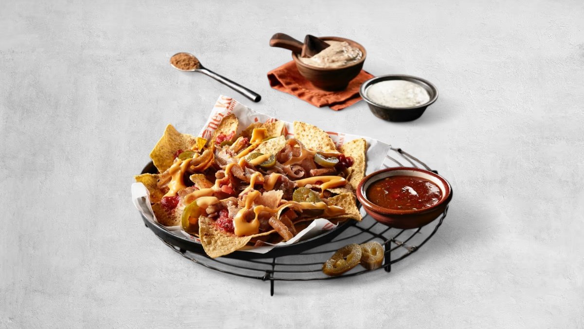 Nachos, som serveras med salsa sås, Jalapeno och Nachos krydda. Såserna Stark, Vitlök och Mild medföljer.