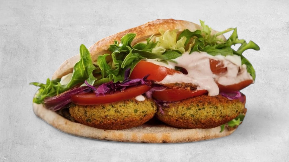 Vår egna pitabröd, sallad, lök, tomat, rödkål och -såserna vitlök och original, Välj mellan falafel och Umph!