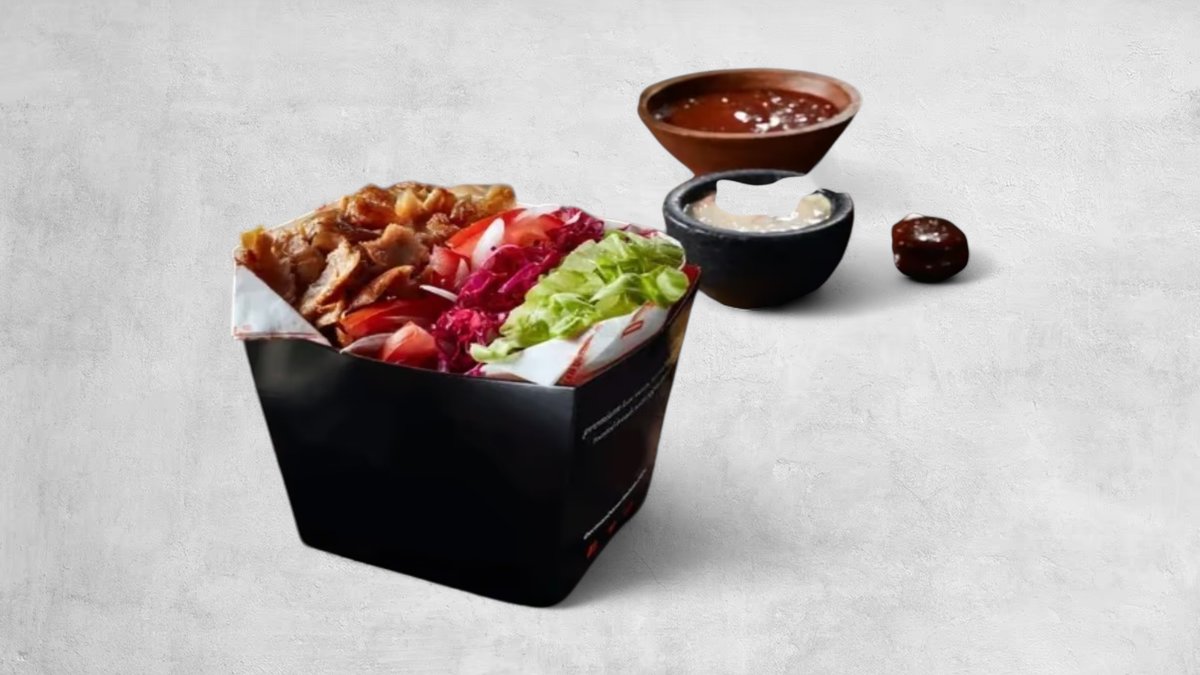 Serveras med Pommes i boxen samt isbergssallad, tomat, lök och rödkål. Välj mellan kalv, kyckling och mixkött i nästa steg. Vitlök och Mild-sås och levereras vid sidan om.