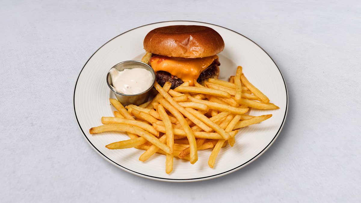 Brioche, rökt smör, cheddar, picklad silverlök, bacon, chilimarmelad, pommes och husets majonnäs.