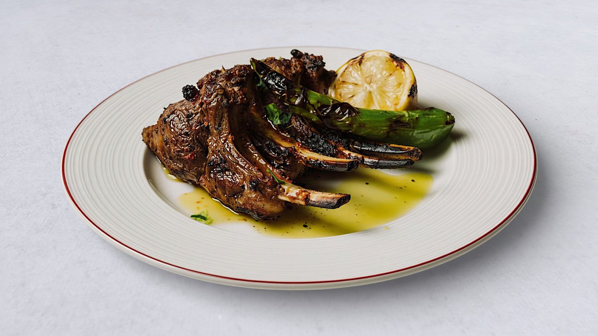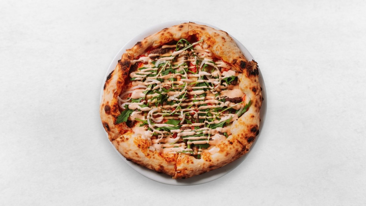 San Marzano, Fior di Latte, entrecotè, picklad grön chili, harissa, kebabsås, silverlök och ruccola.