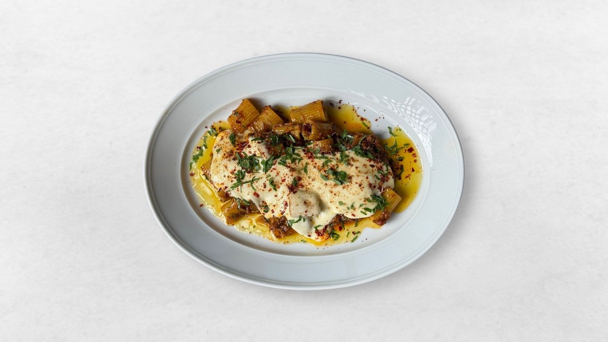 Ragù med bräserad högrev, paprika, lök, selleri och gratinerad ostcrème.