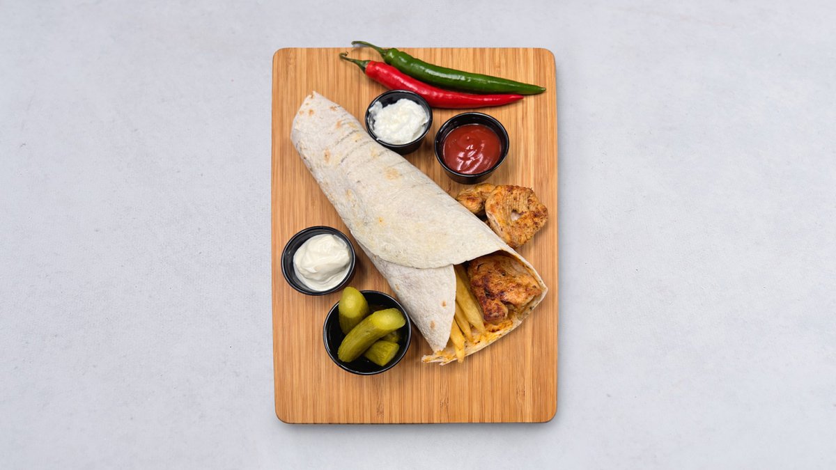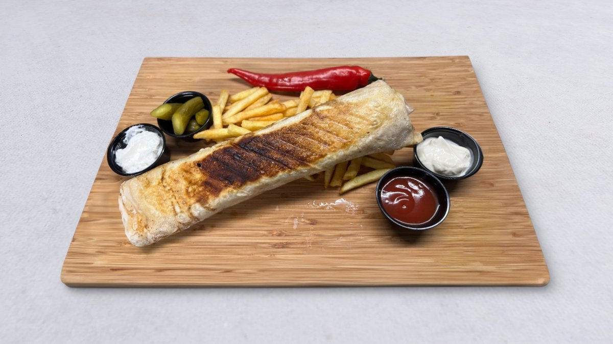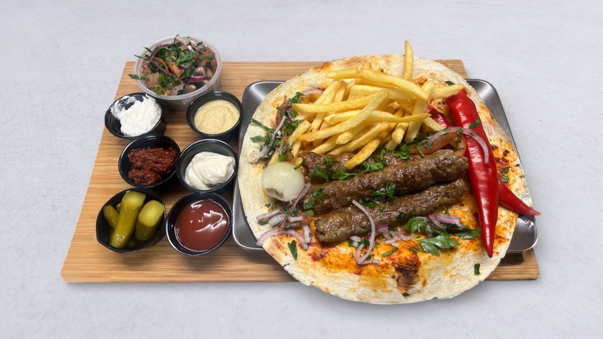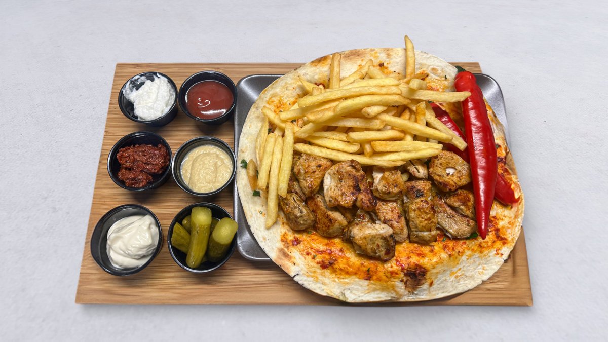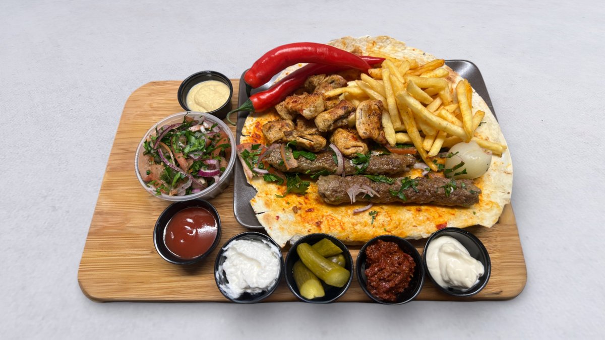 Serveras med 4 st spett (2 st kyckling och 2 st lamm), pommes, grillad paprika, sallad och bröd.