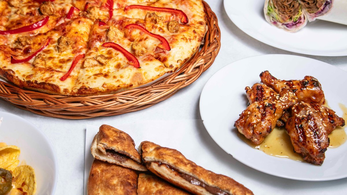 Tomatsås, ost, lök, paprika, svamp, oliver och majs.