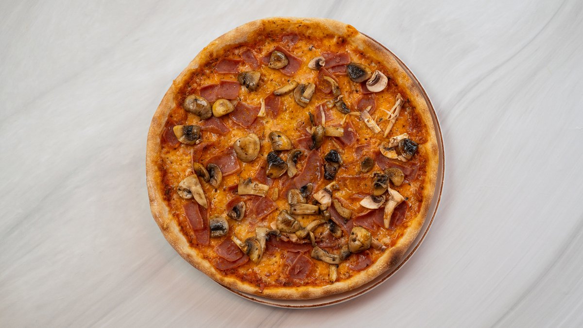 Skinka, champinjoner, räkor, musslor, oliver och kronärtskocka.