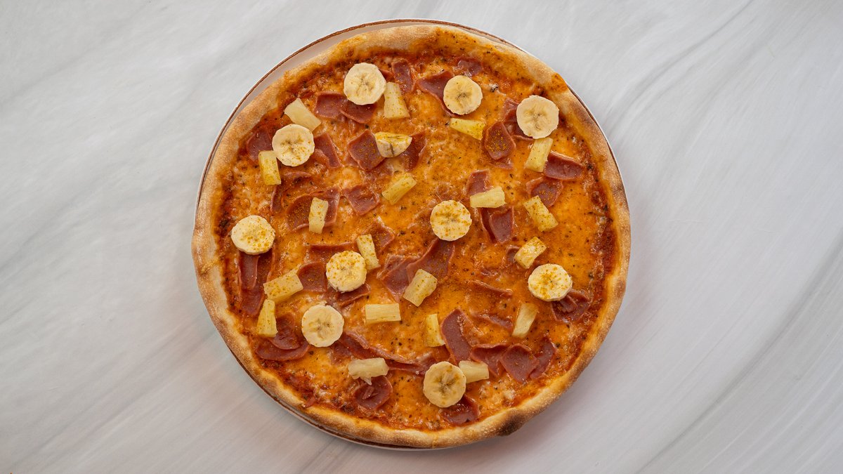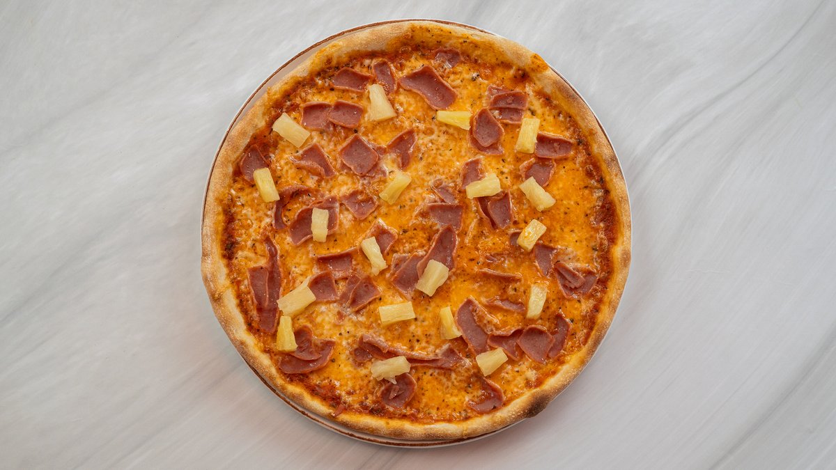 Champinjoner, ananas, lök, paprika, tomater, oliver och kronärtskocka.