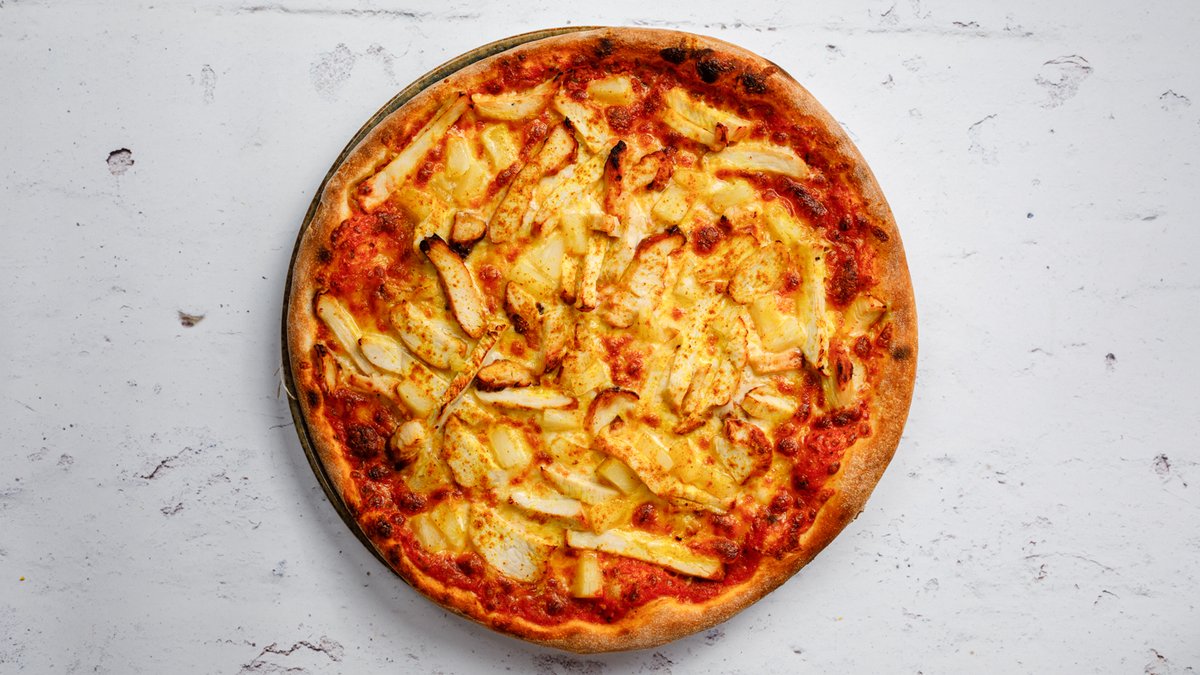 Tomatsås, ost, kyckling, lök, tomater och curry.