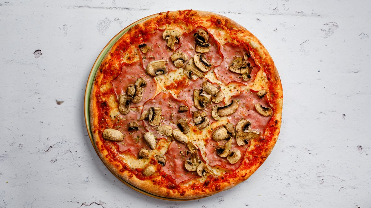 Tomatsås, ost, skinka och champinjoner.
