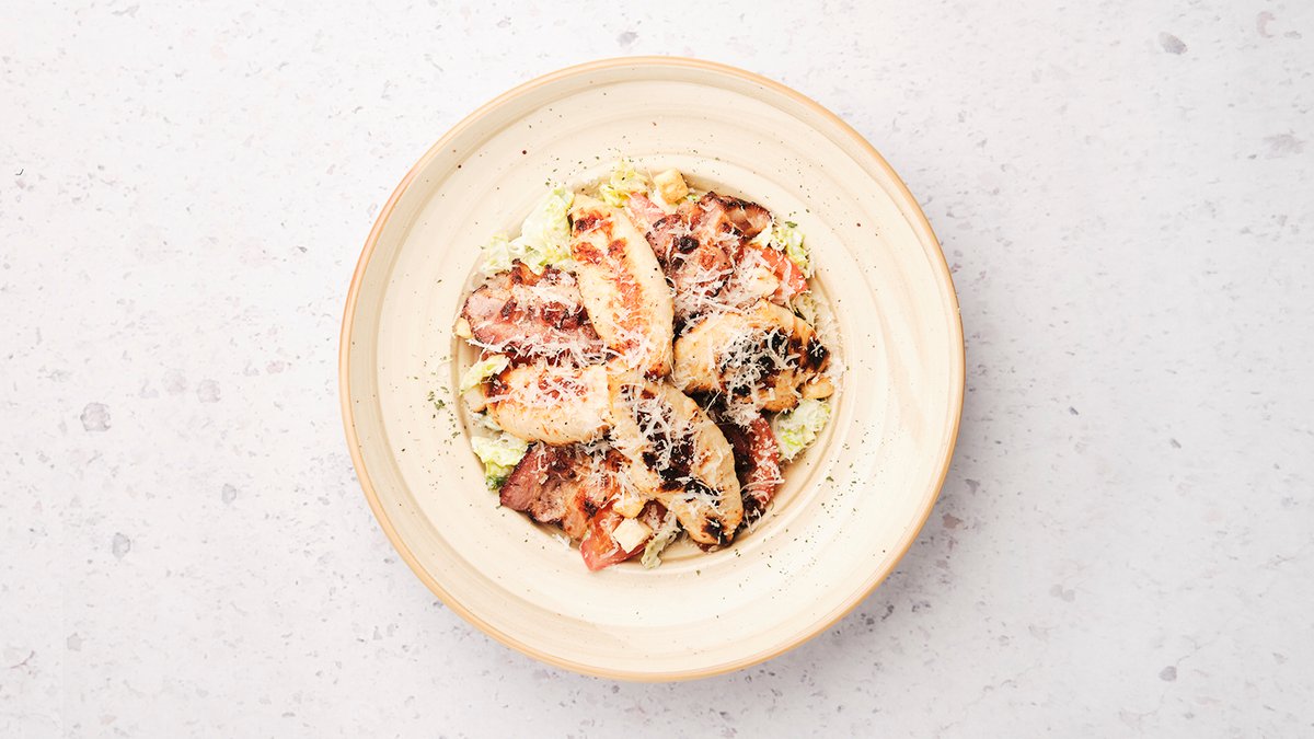 Bacon, kyckling, brödkrutonger och parmesan, romansallad och caesardressing.