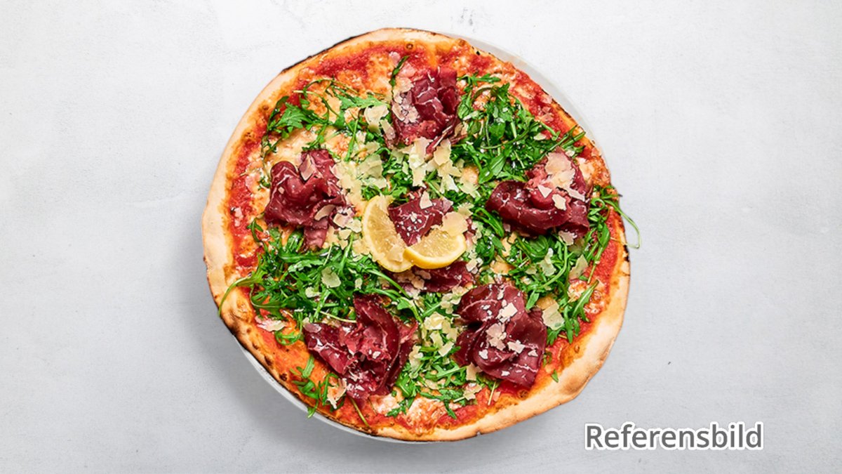 Tomatsås, ost, mozzarella, bresaola, chèvrecrème och ruccola.