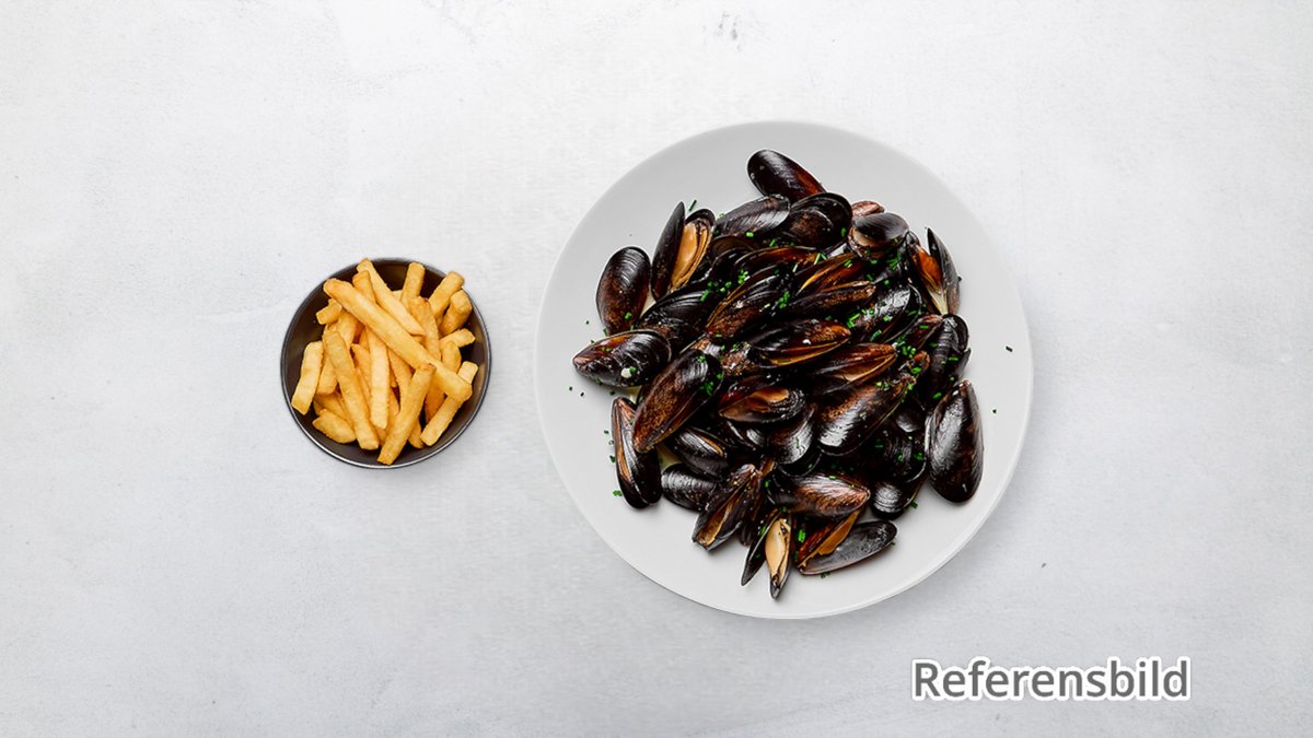 Vitvinsmarinerade musslor och pommes.