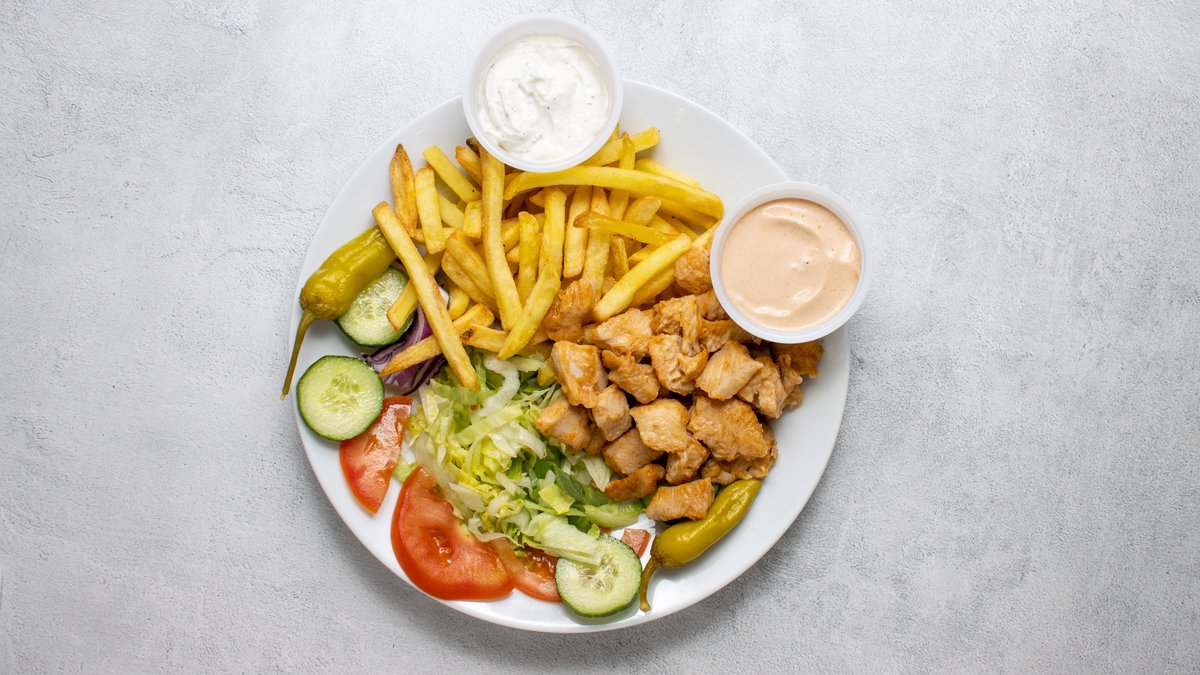 Tacosås, ost, kebabkött, majs, rödlök, jalapeño och nacho chips.
