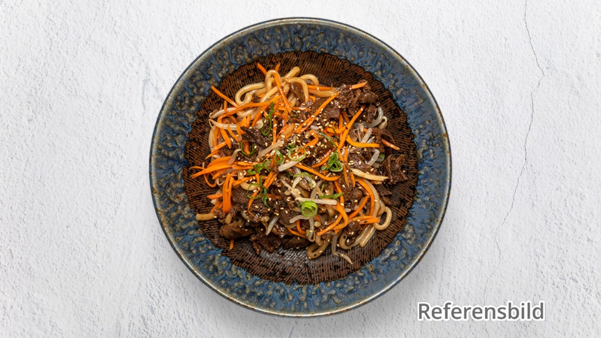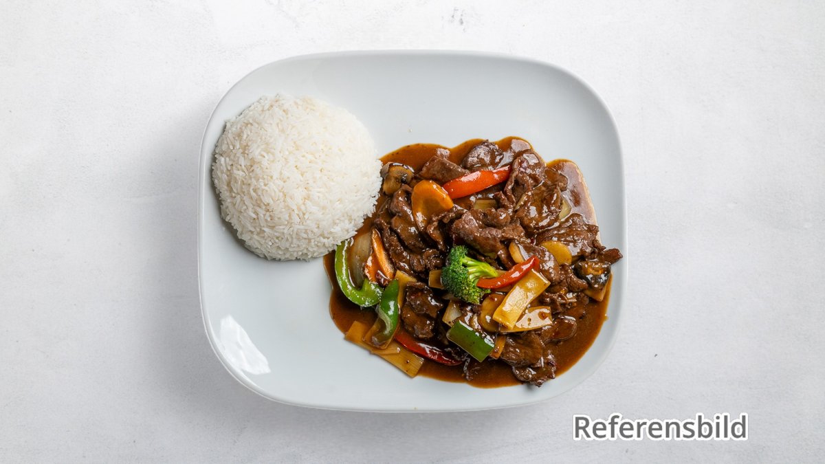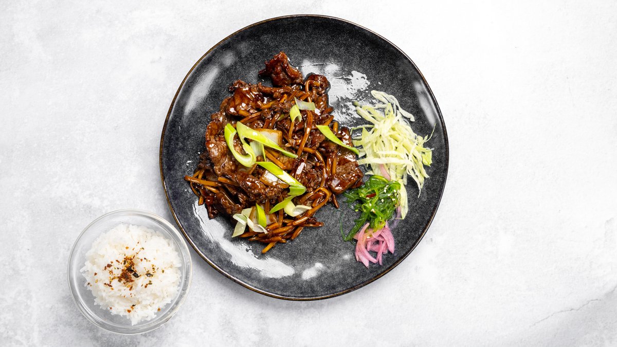 Klassisk rätt med tunt skivade biff, gul lök och i en lätt sojasås.
