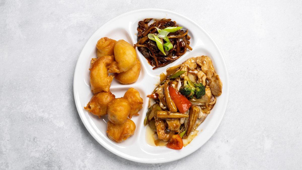 Kyckling med grönsaker. Biff med bambuskott. Friterad kyckling 3 st. Friterad räkor 4 st.