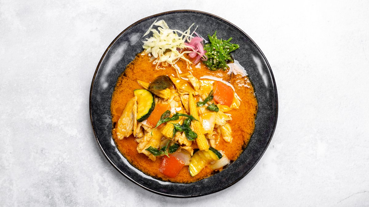 Wokade kyckling med grönsaker i thai currysås.