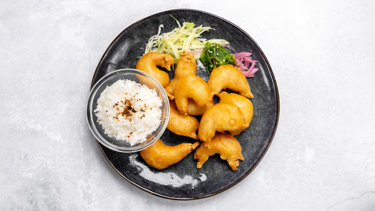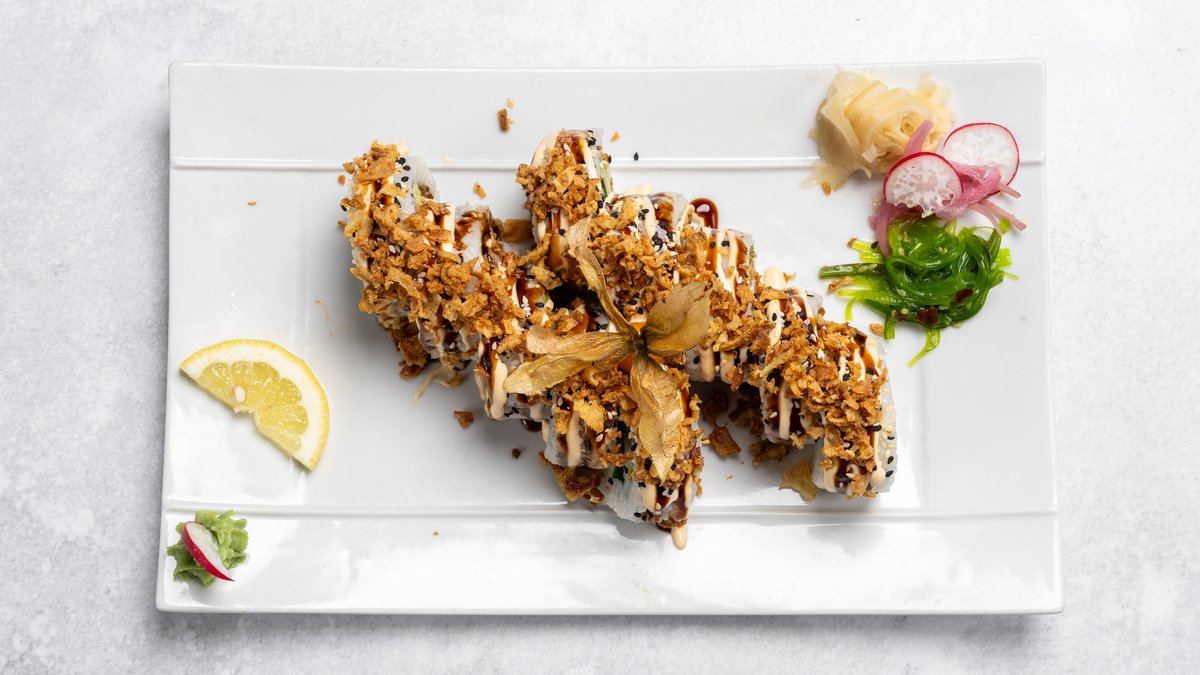 Friterad kyckling, räkor, gurka, avokado. Toppad med chilimajonäs, teriyakisås och rostad lök.