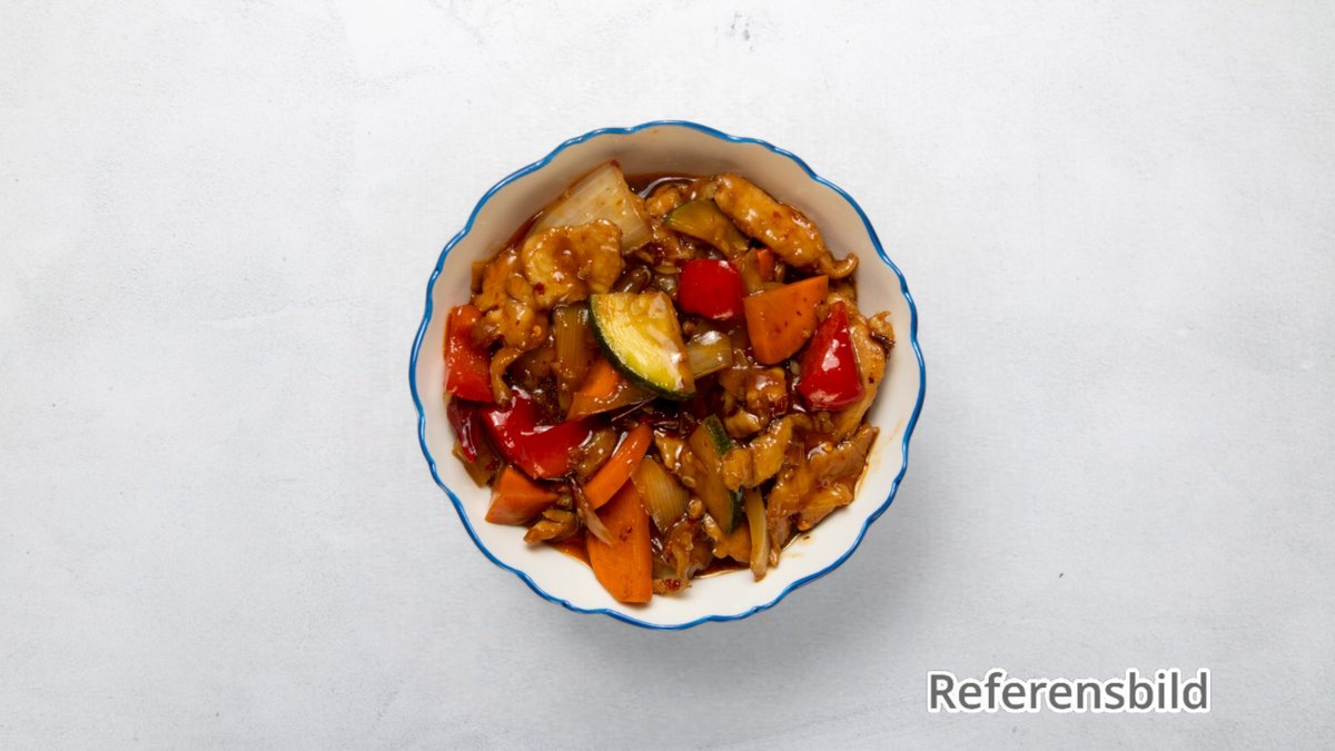 Wokade kyckling med grönsaker och sichuansås.