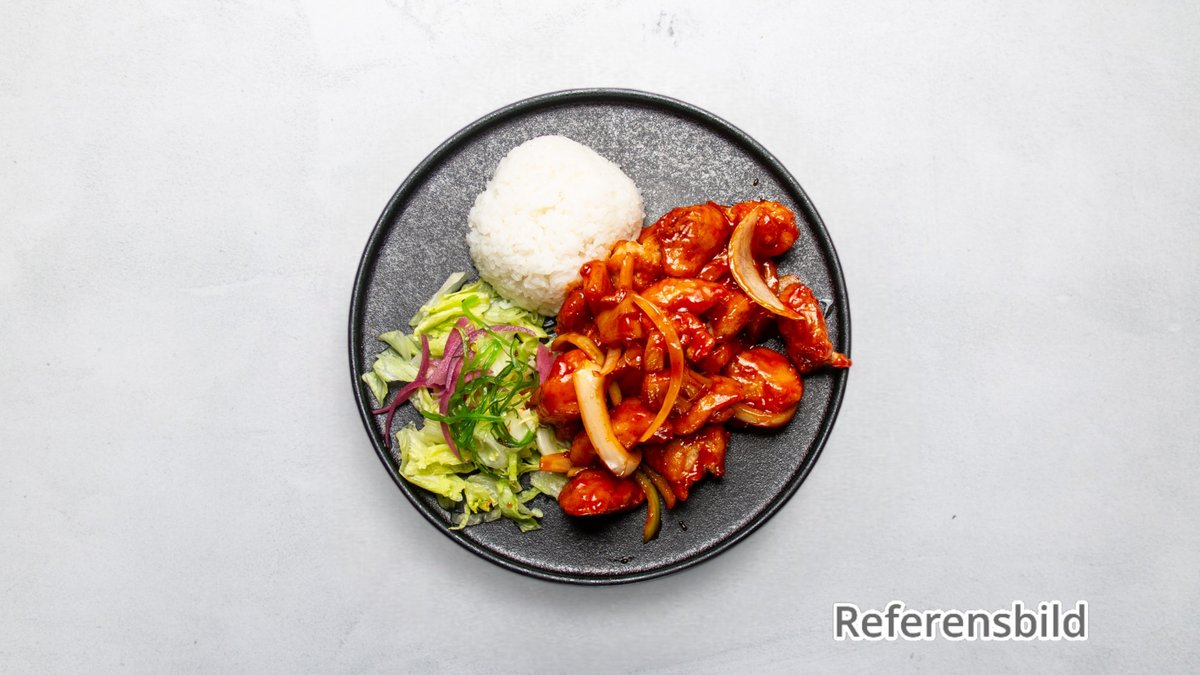 10 st friterad jätteräkor wokade med lök och paprika. Serveras med sweet chilisås.
