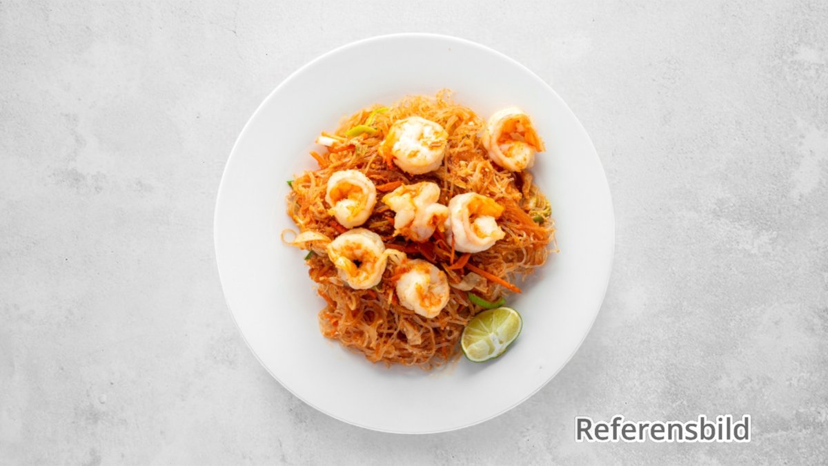 Stekta nudlar med kyckling, räkor, ägg och grönsaker.