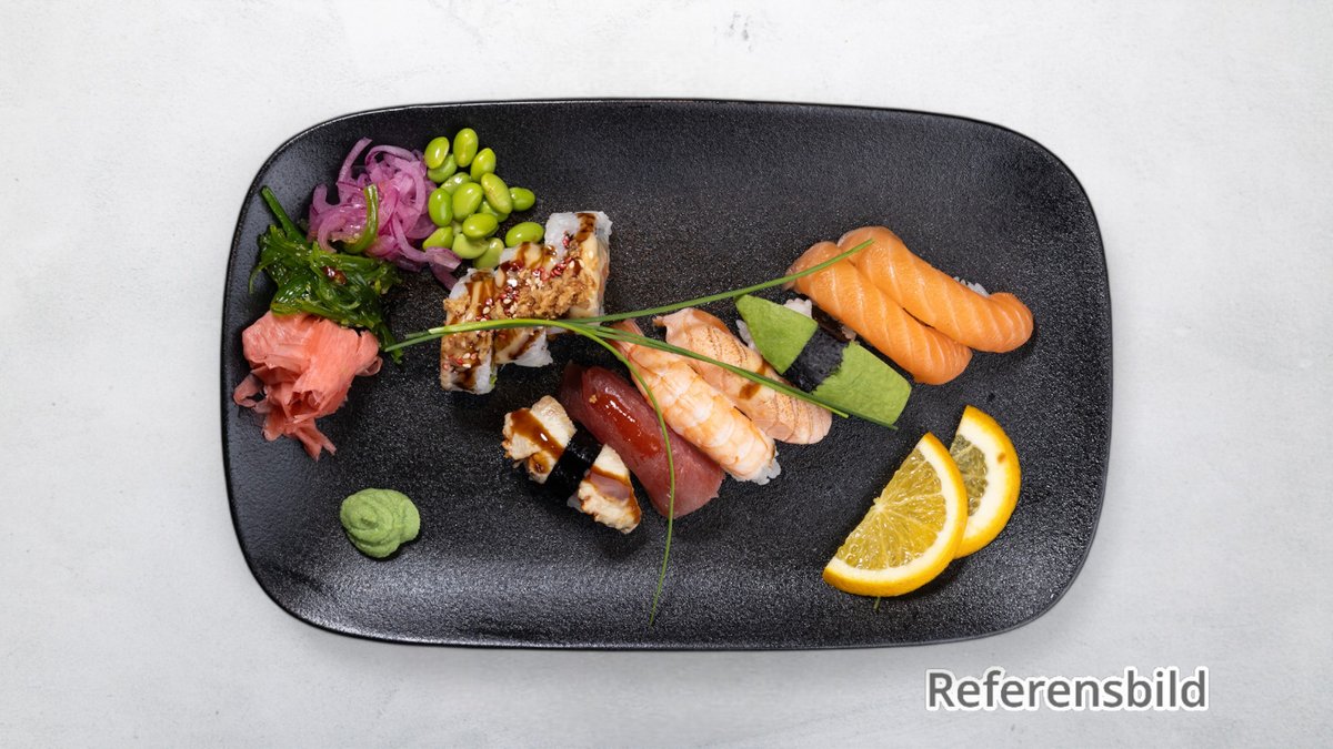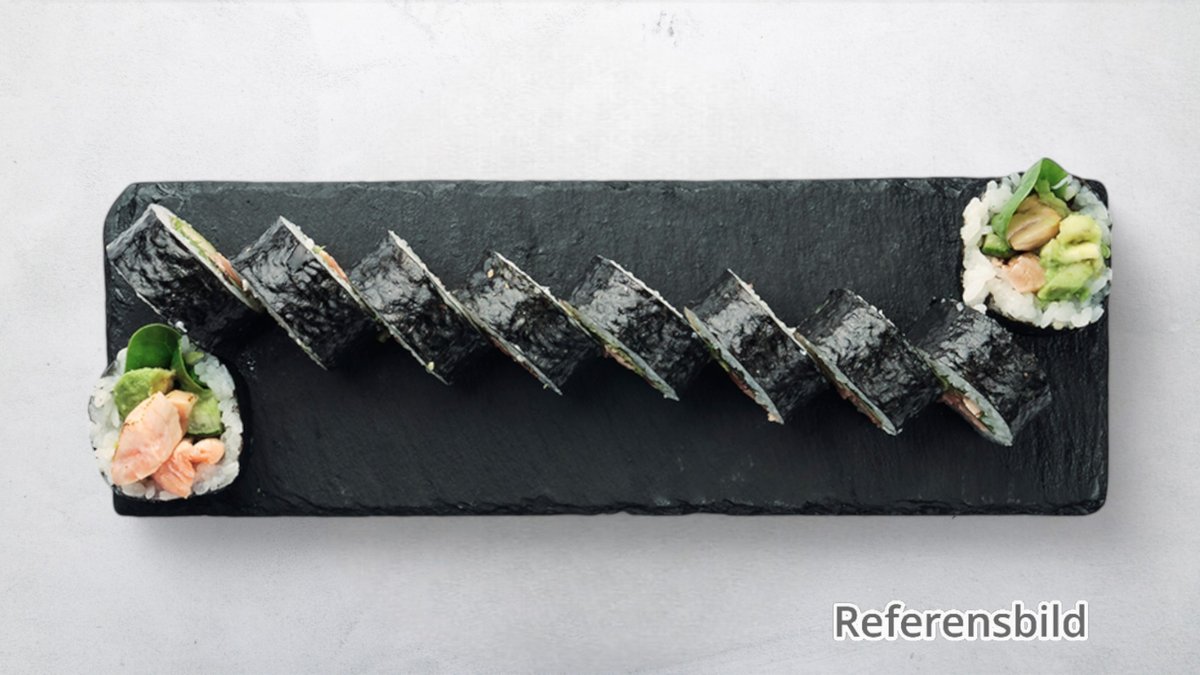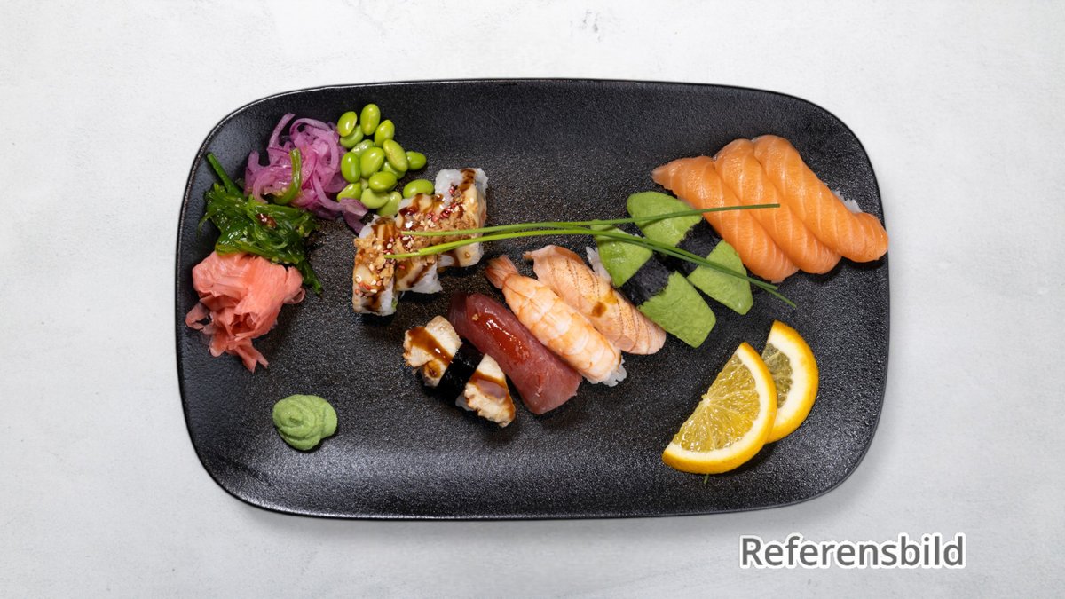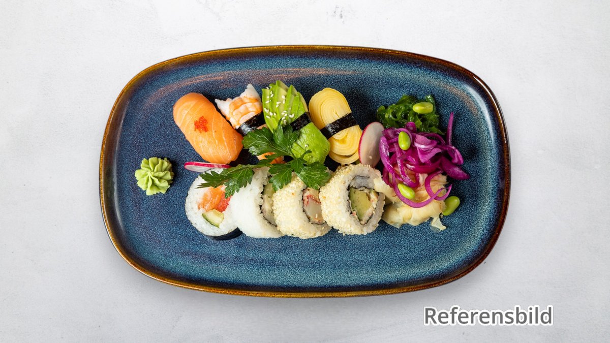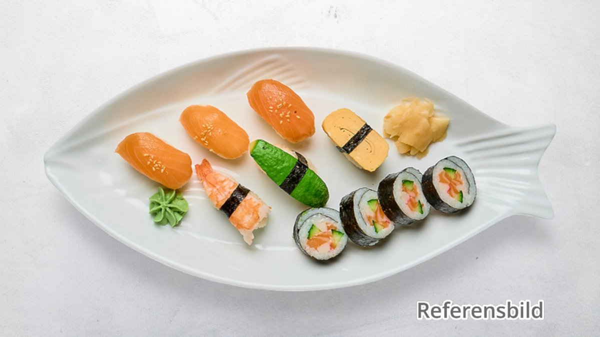 1 lax, 1 räka, 1 tonfisk, 1omelett, 1crab, 1 avokado 4 blandade maki.