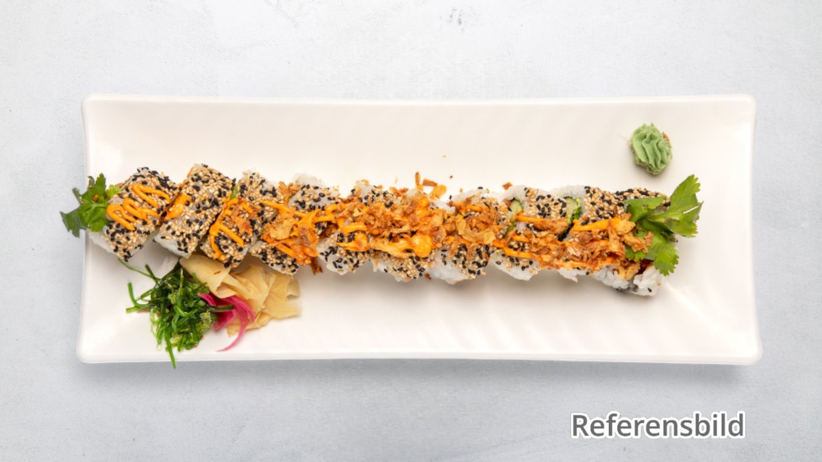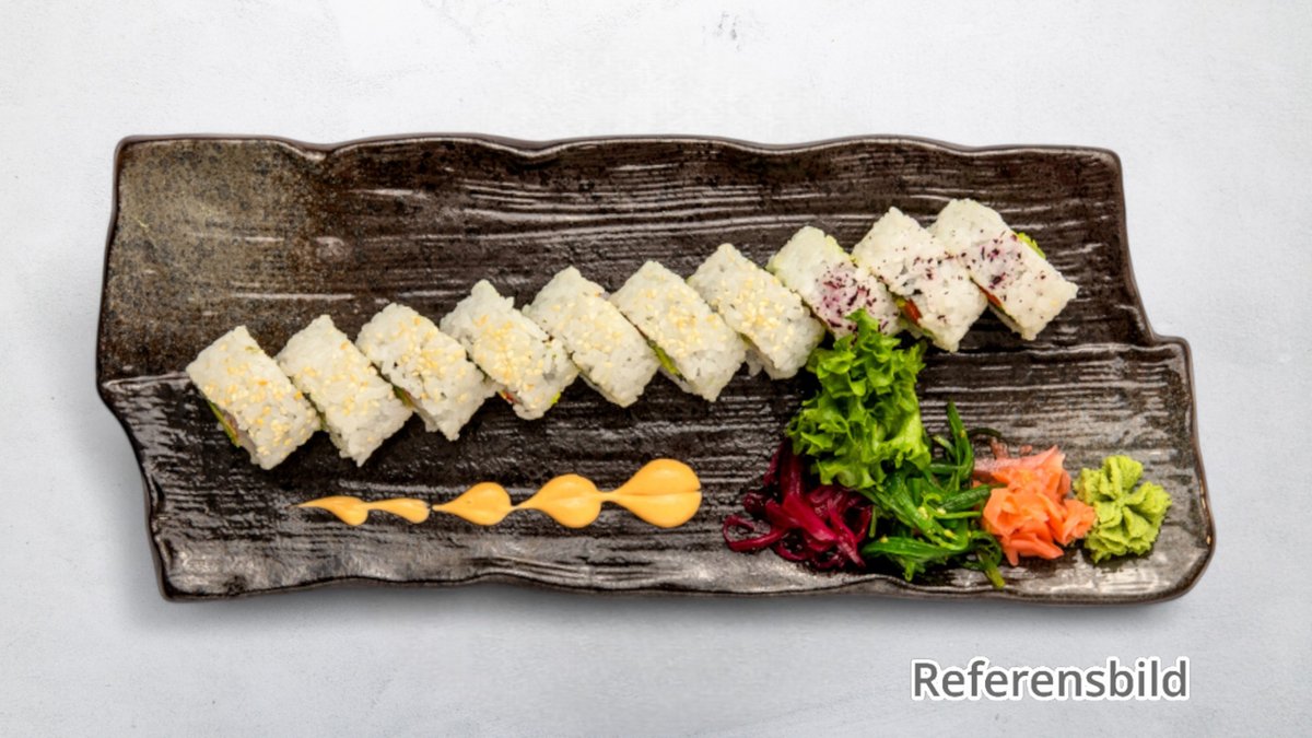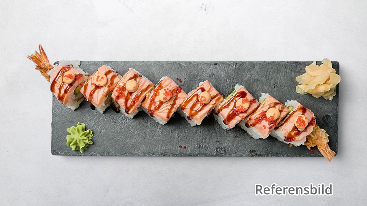 Avokado, crabfish, philadelphiaost, lax, tonfisk, räka, avokado, chilimajonnäs, rom och teriyakisås.