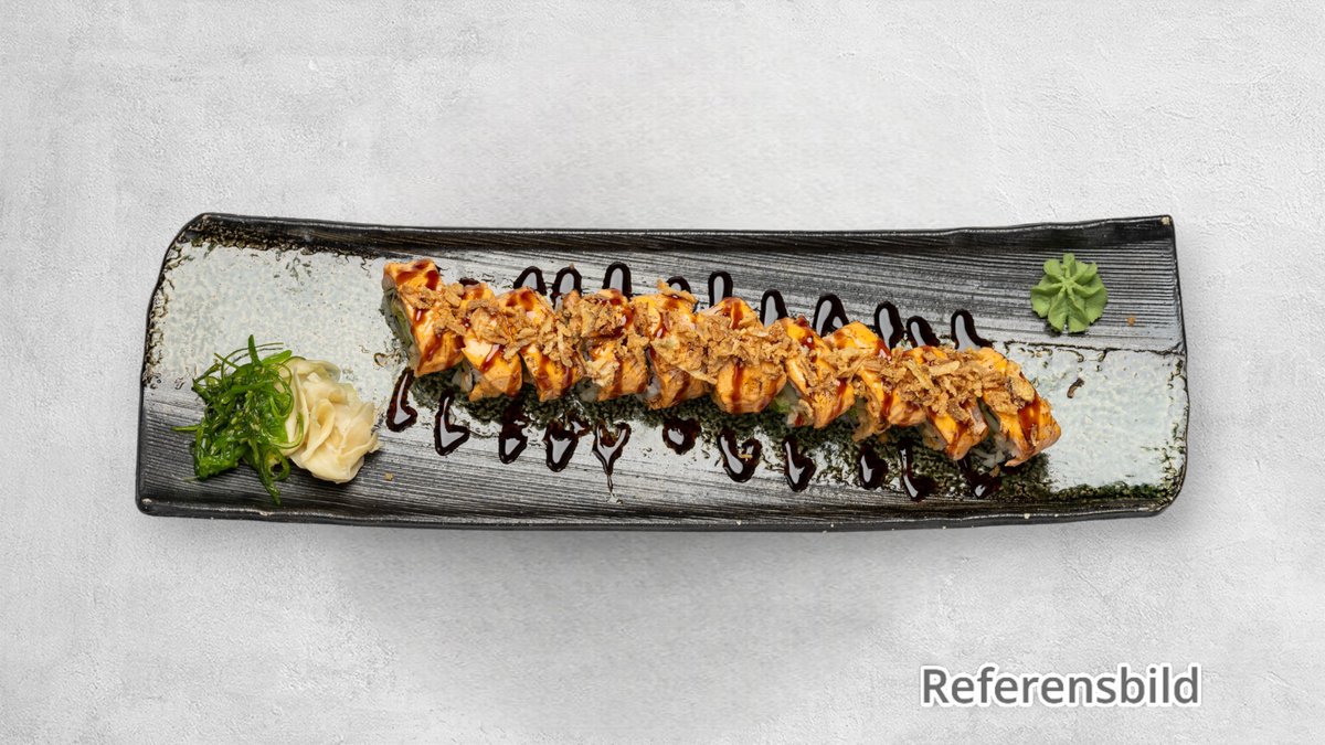 Avokado, crabfish, philadelphiaost, flamberad lax, unagisås och kryddor.