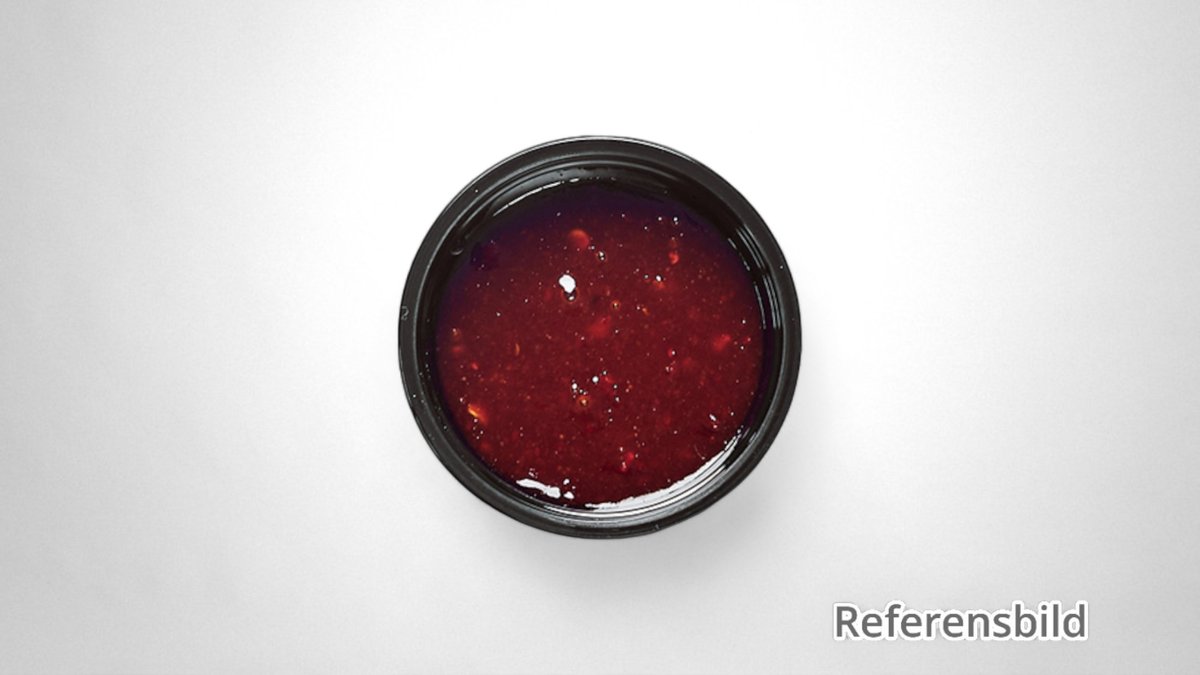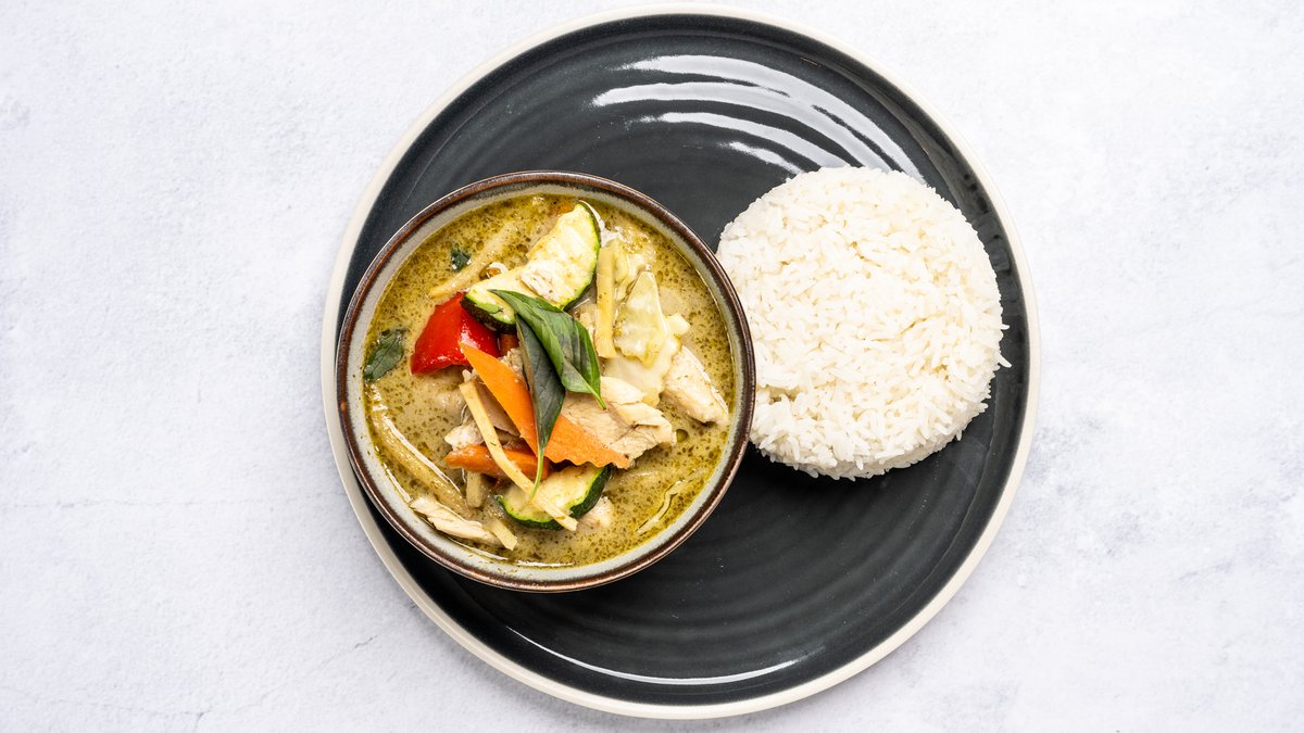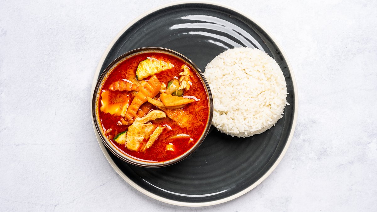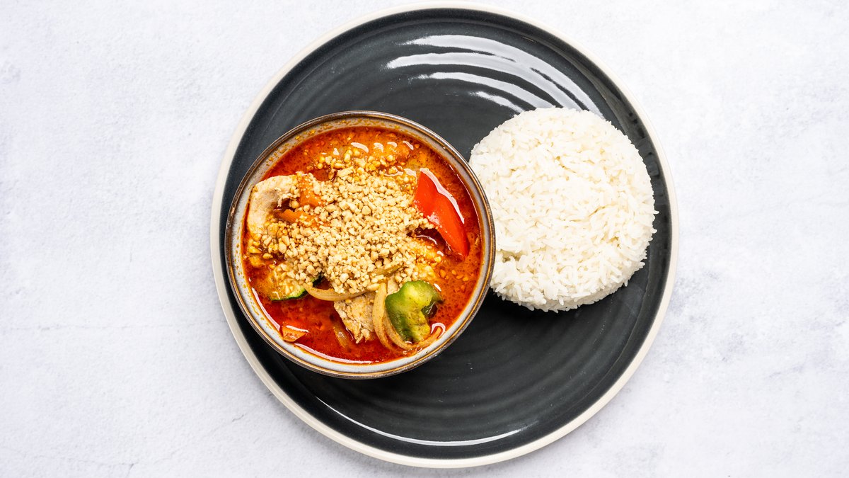 Rödcurry, kokosmjölk, bambuskott, grönsaker och basilika. Mediumstark.