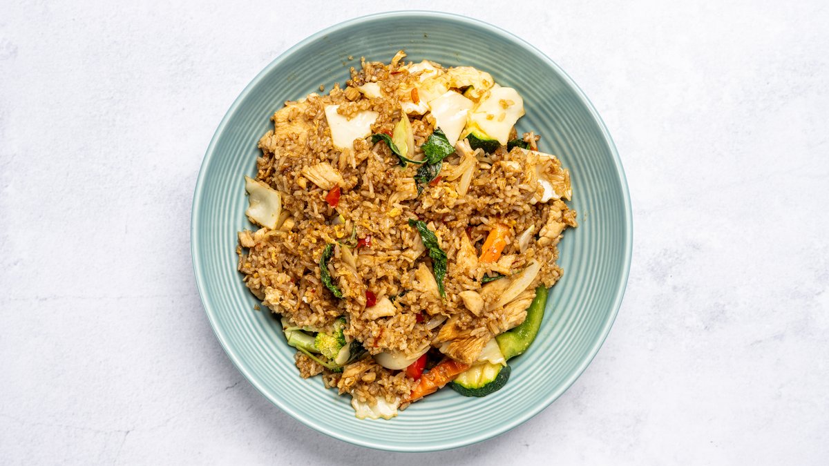 Stekt ris, grönsaker, ägg chili, vitlök, hotbasilika och ostronsås. Stark.