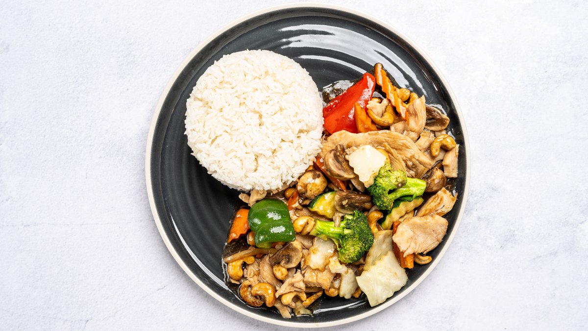 Grönsaker, champinjoner, cashewnötter, thaistationsås och doftande sesamolja. Serveras med jasmine ris.