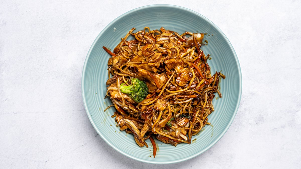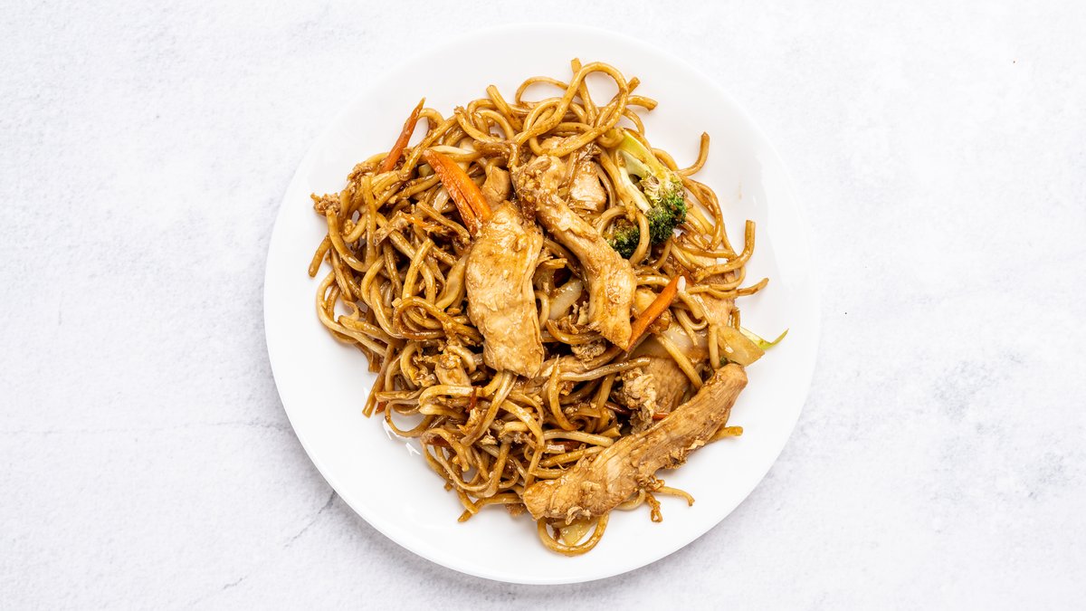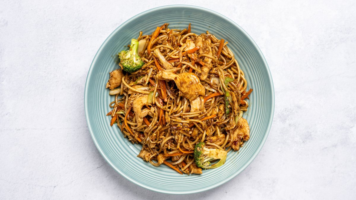 Wokade äggnudlar med kyckling, ägg och grönsaker.