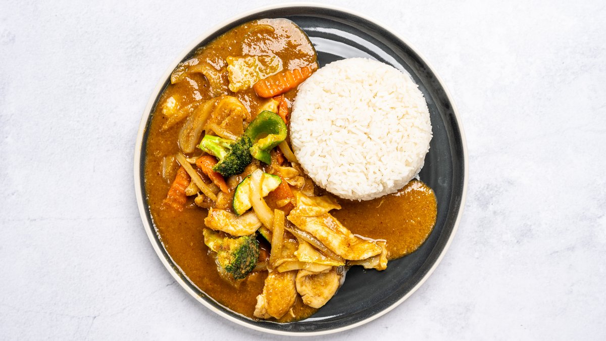 Panangcurry, kokosmjölk, grönsaker och doftande limeblad. Mediumstark.