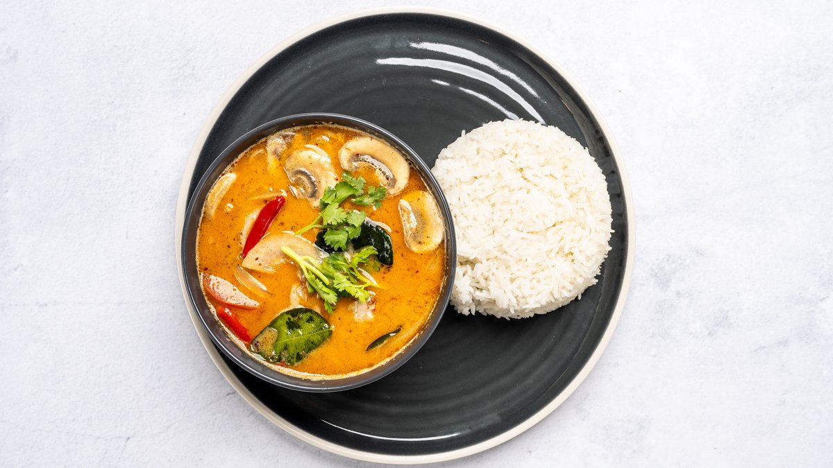 Stark syrlig räksoppa med räkor, chilipasta, kokosmjölk, citrongräs, limeblad, koriander och galanga. Serveras med varmt kokt jasmine ris.