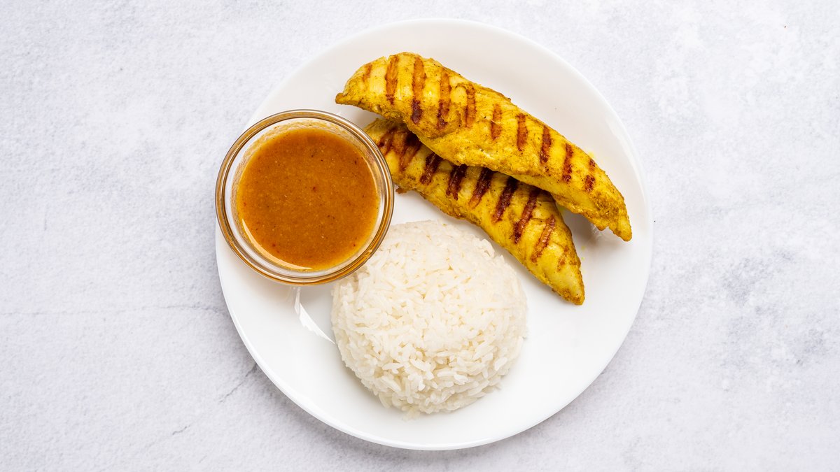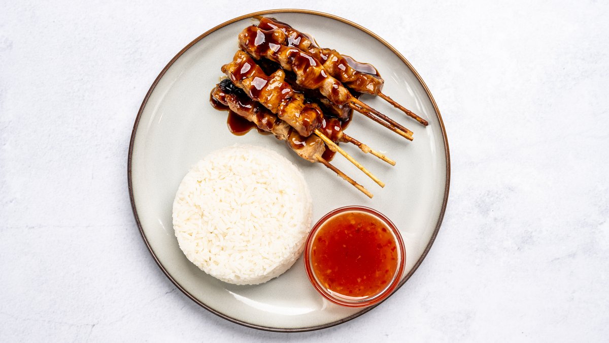 Thaistations recept 4st kryddmarinerade kycklingspett serveras med jordnötssås och varmt kokt jasminris