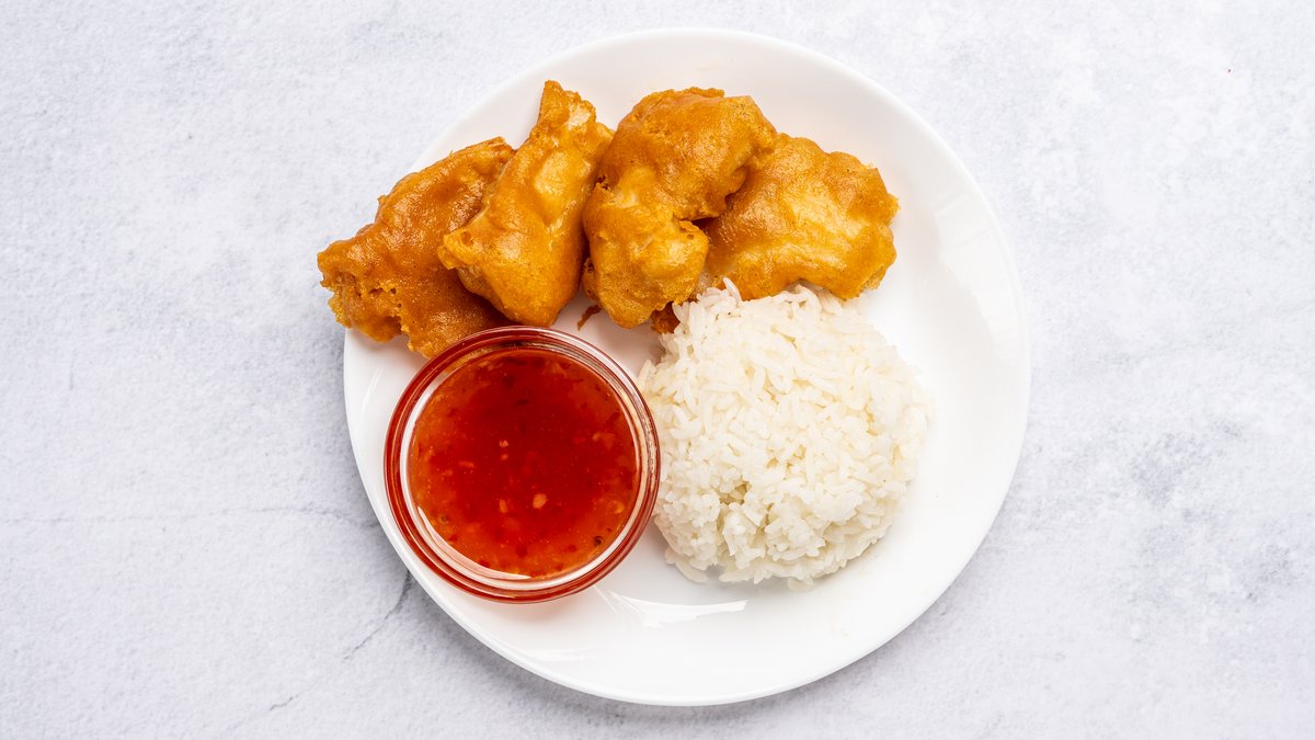 Friterad kyckling eller räkor, serveras med varmt kokt jasmine ris och sötsursås (man kan byta sås)