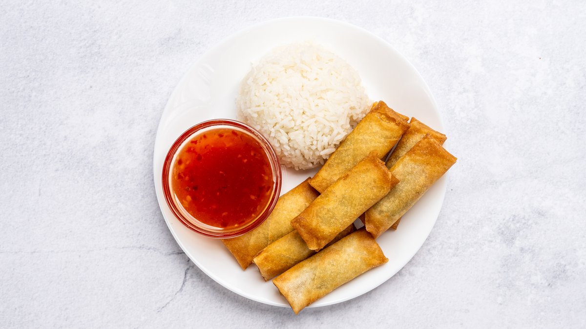 Friterade vegetariska vårullar. Serveras med sötsursås.