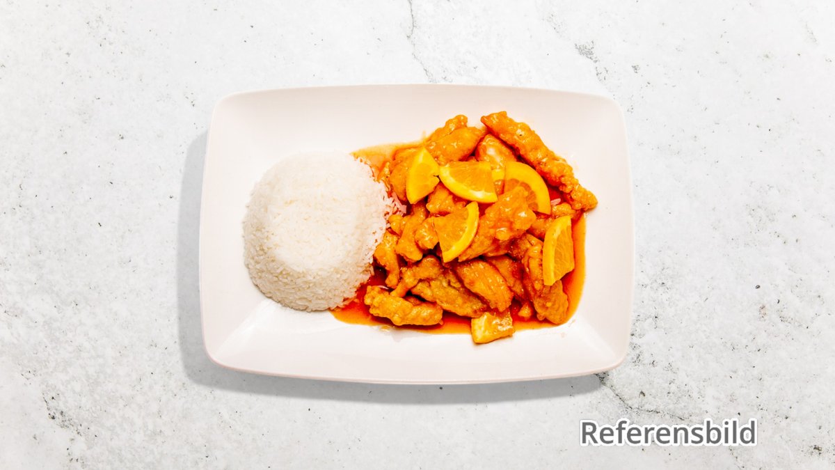 Wokad krispy kyckling i sötsur sås och ananas, lök och paprika.