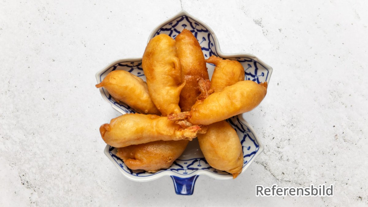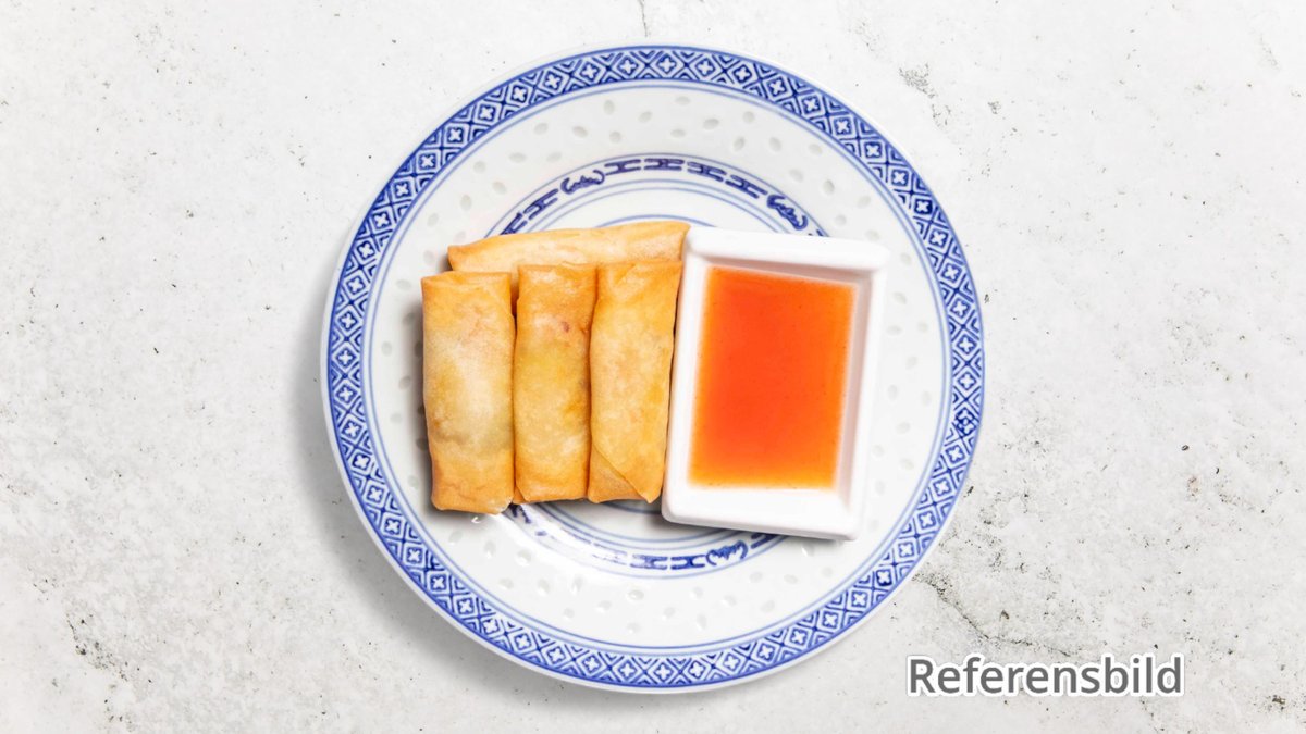 Vårrullar med ris eller pommes frites och sweet chili sås.