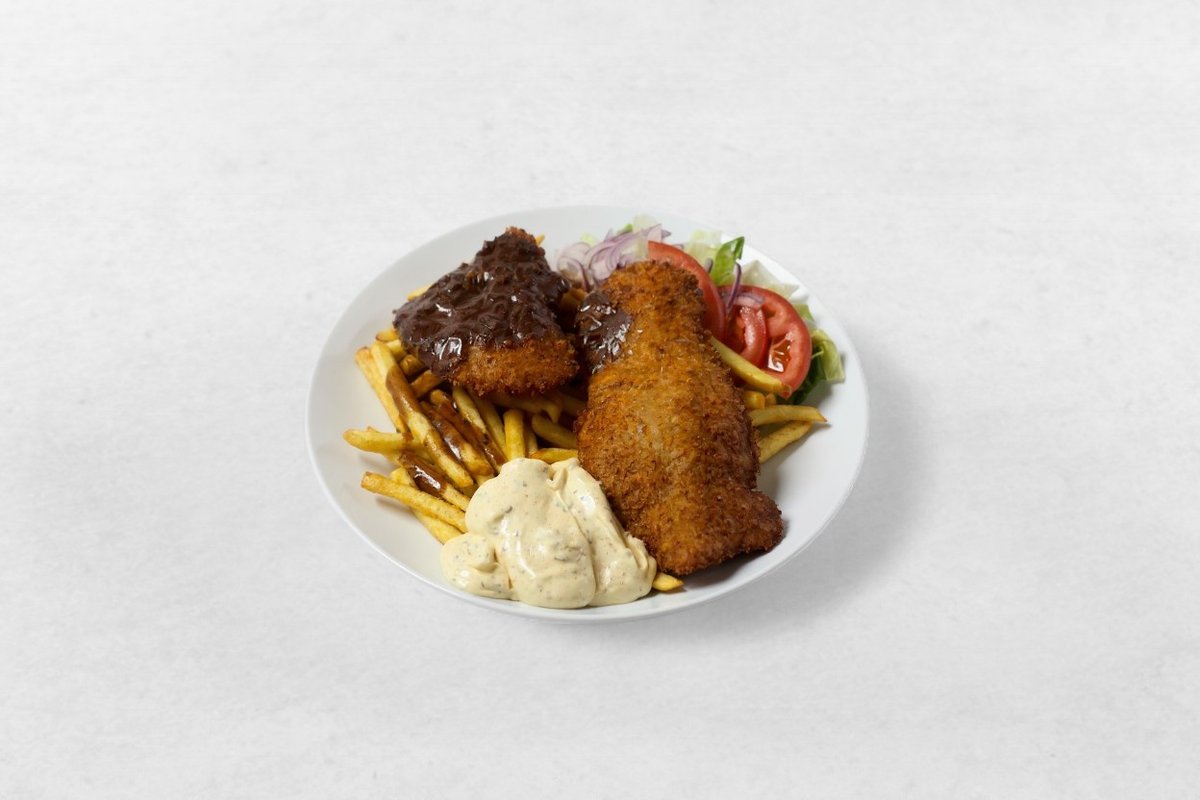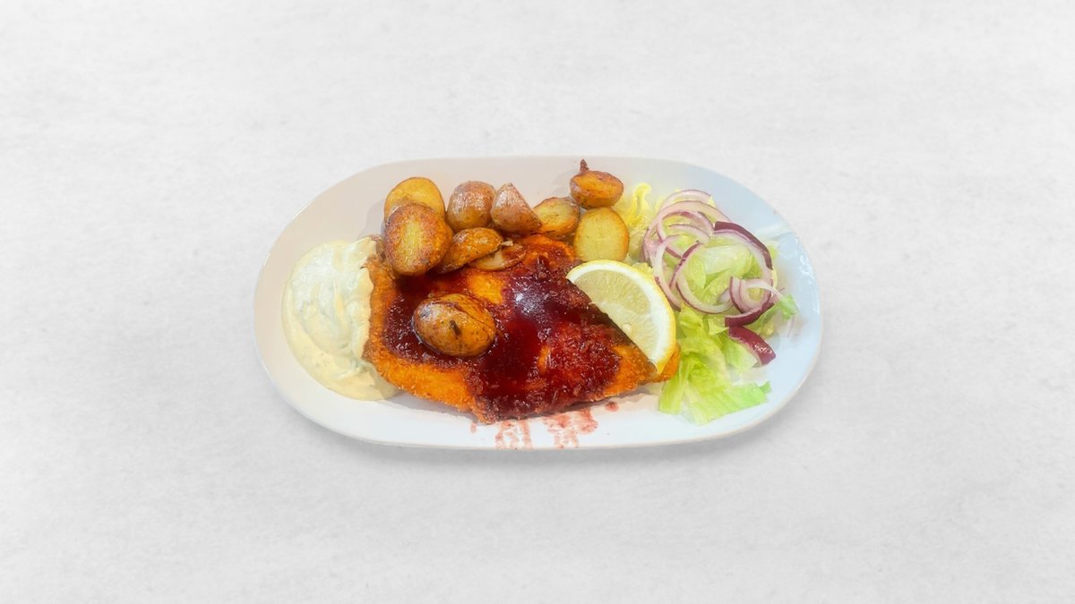 150g burgare med BBQ sås, chilimajonnäs, tomater, krispsallad, picklad rödlök och cheddarost.
