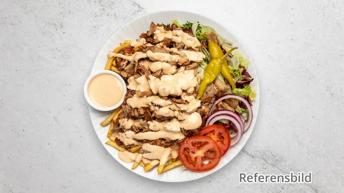 Alla gyrosrätter serveras med isbergssallad, tomat, lök, feferoni och sås. Välj sås.
