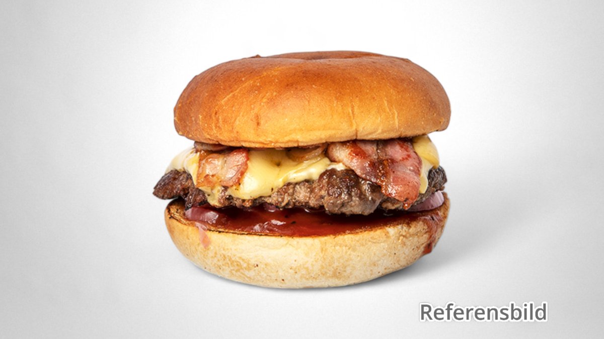 Våra 150 g högrevsburgare serveras med, picklad lök, tomat, sallad, dressing och pommes.