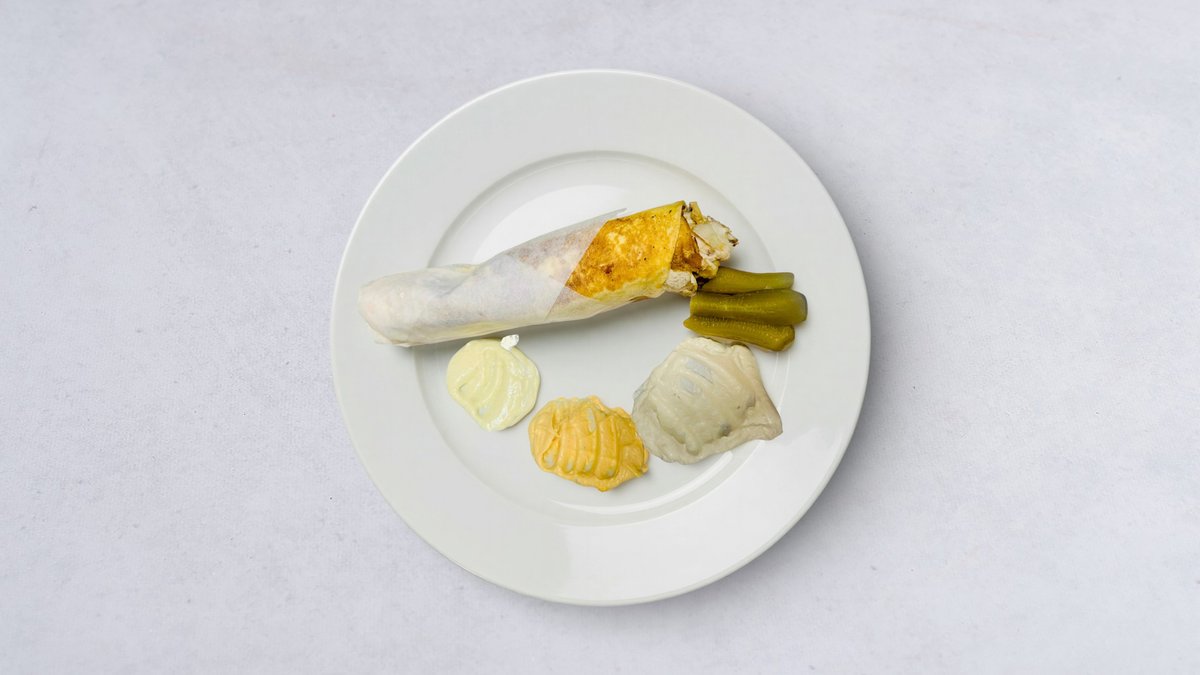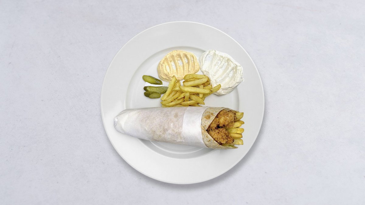 Krispig friterad kycklingfilé, pitabröd, grönsaker, vitlökssås och saltgurka.