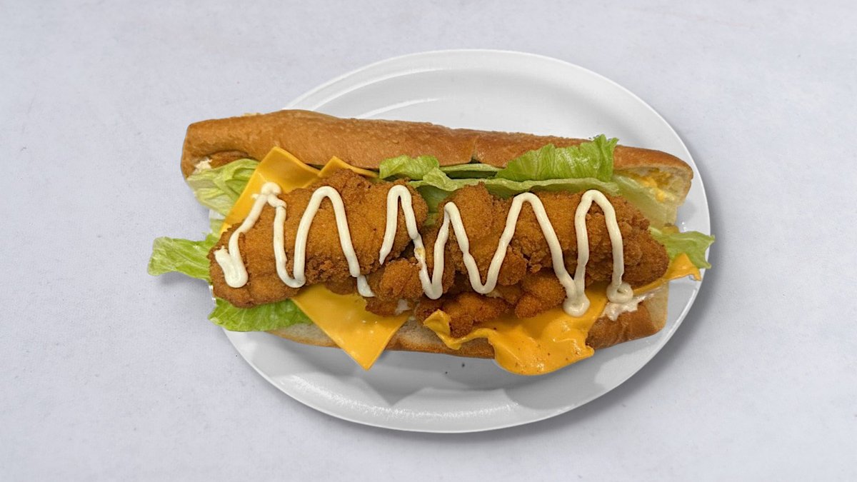 Krispig friterad kycklingburgare, hamburgerbröd, grönsaker, vitlökssås, pommes frites och saltgurka.