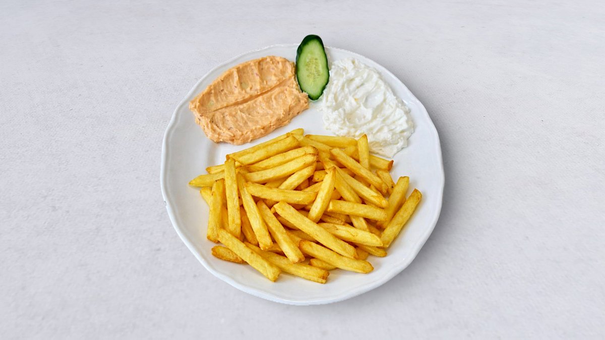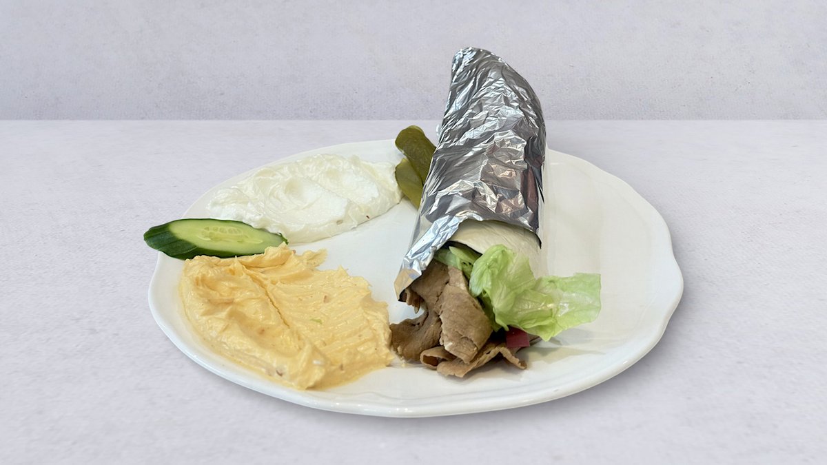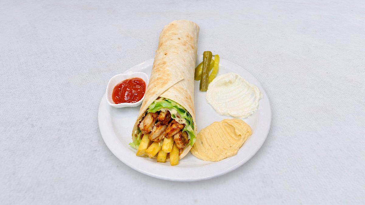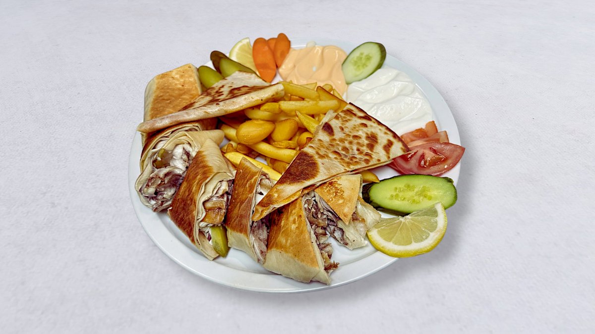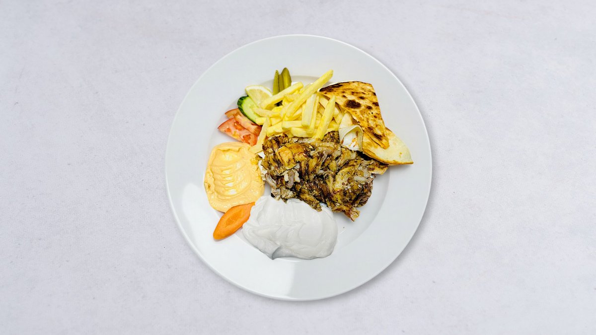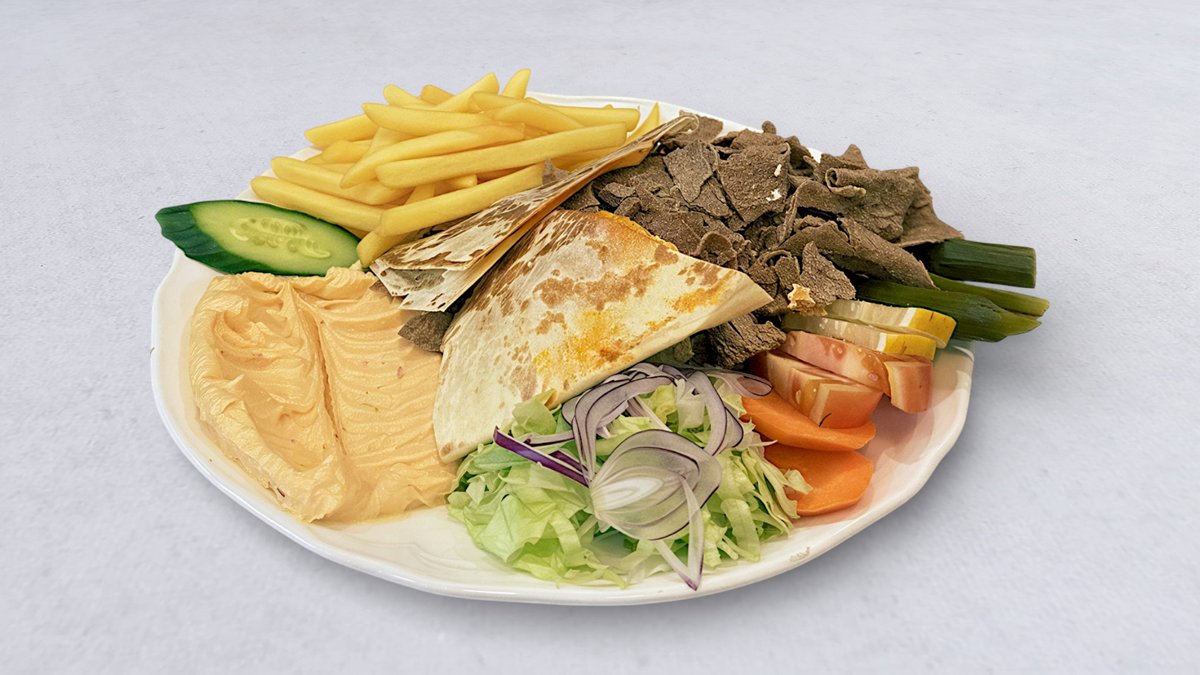 Strimlat nötkött, ris eller pommes frites, grönsaker, pitabröd, vitlökssås och stark sås.