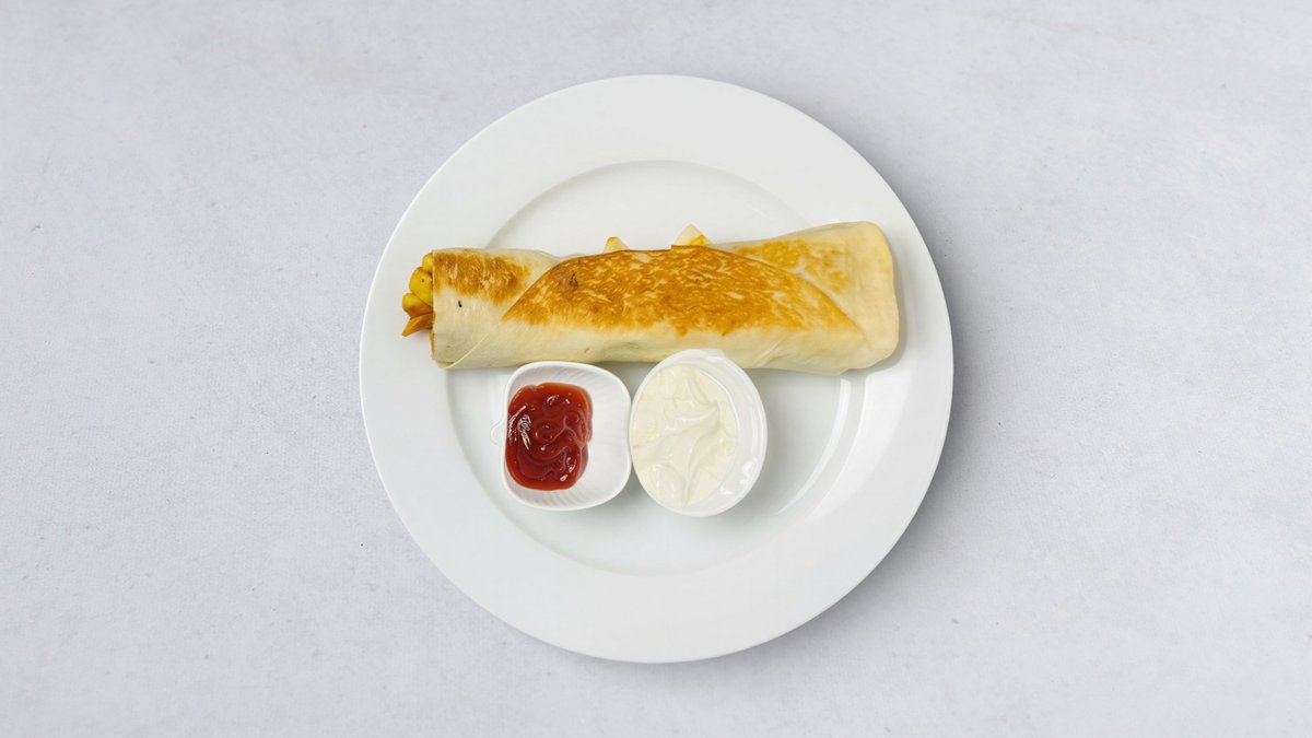 Pommes frites rullade i tortillabröd, ketchup, vitlökssås och saltgurka.