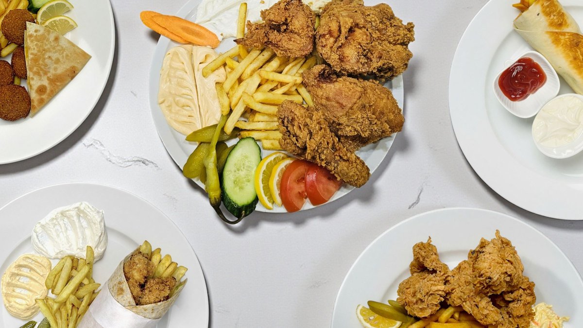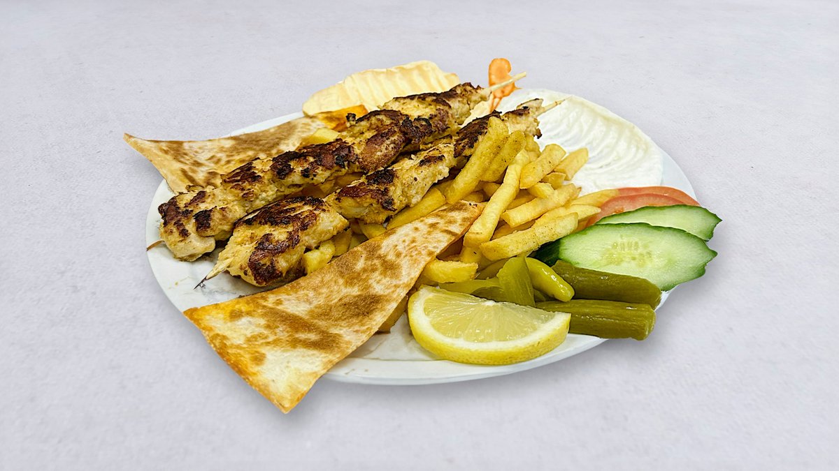 Kyckling (shish taouk), ris eller pommes frites, grönsaker, stark sås, vitlökssås, coleslaw och saltgurka.